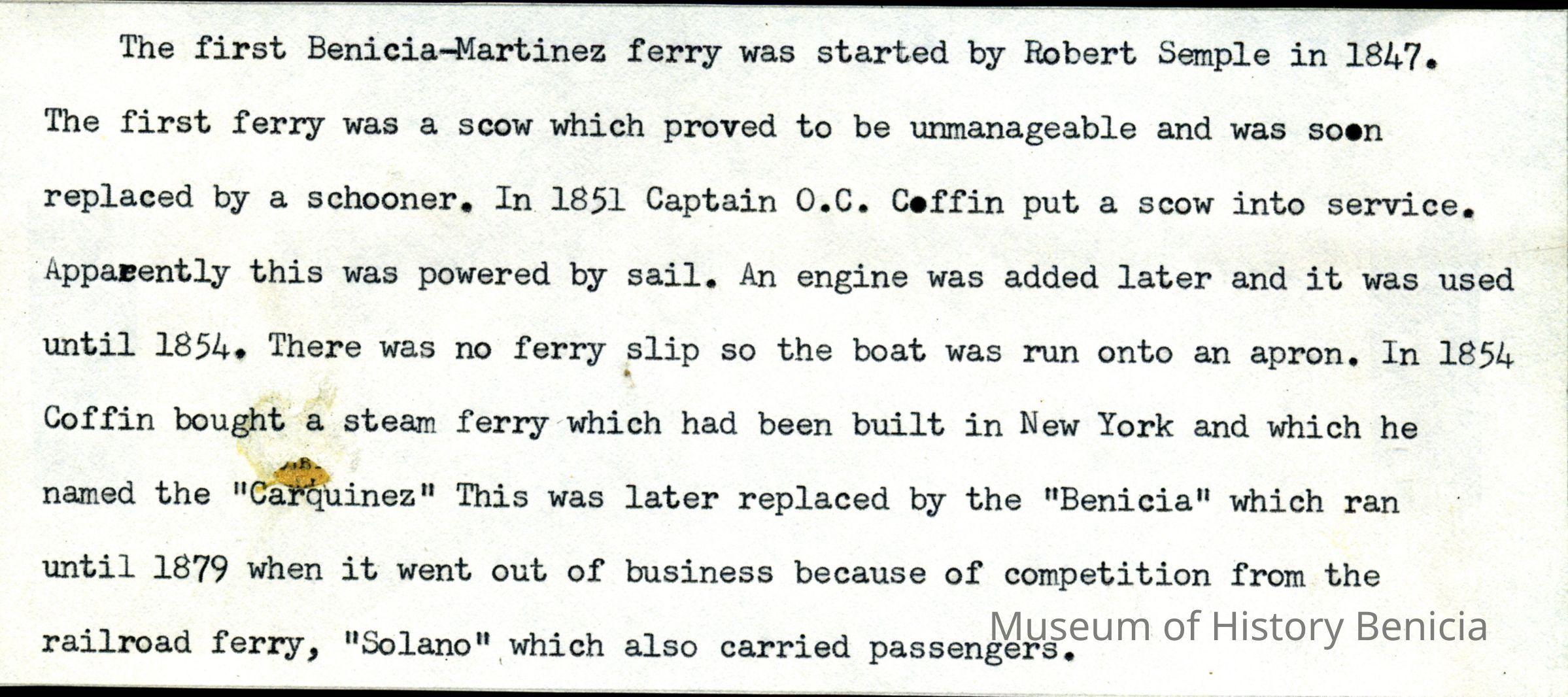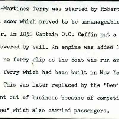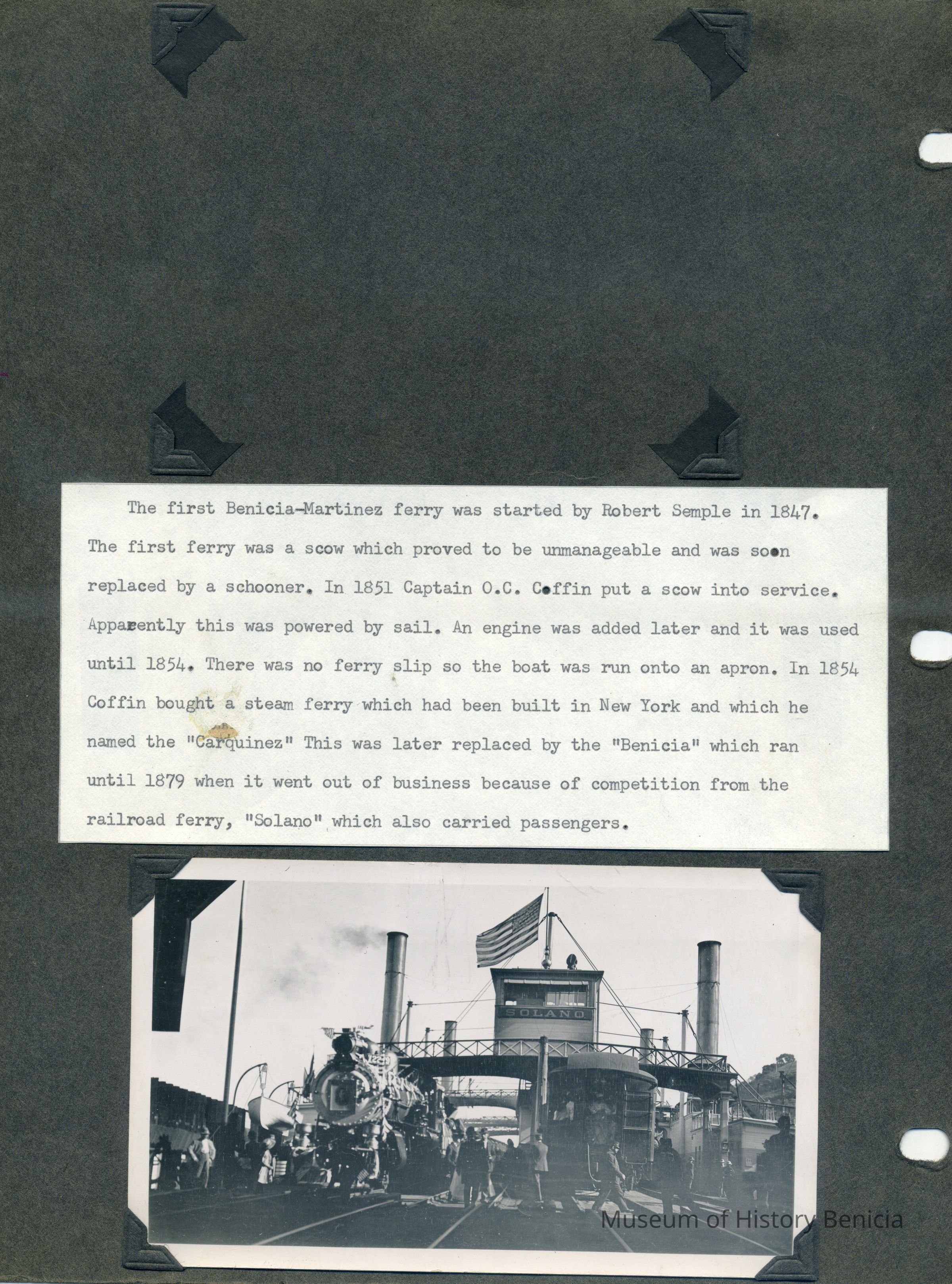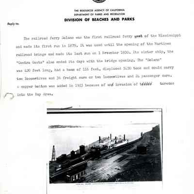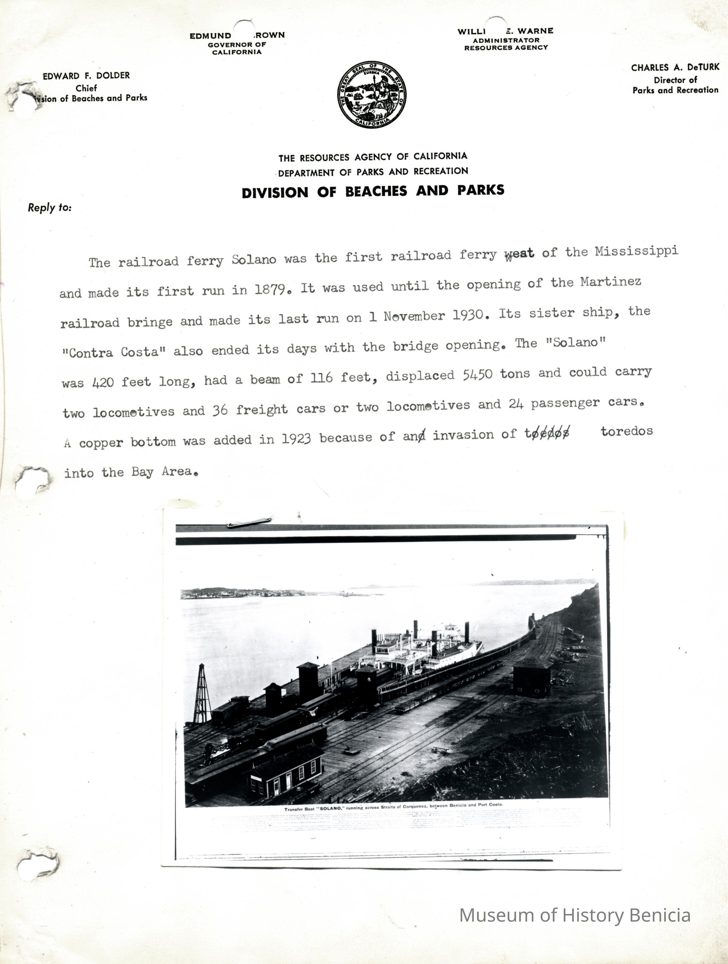 This page has two photos. They are about the ferry Solano. One is a photo with a typed caption above it. The other is a photo attached to a letterhead stationary from the Dept of Parks and Recreation of California. The photo is a copy of a photograph taken by Carleton Watkins.Collection