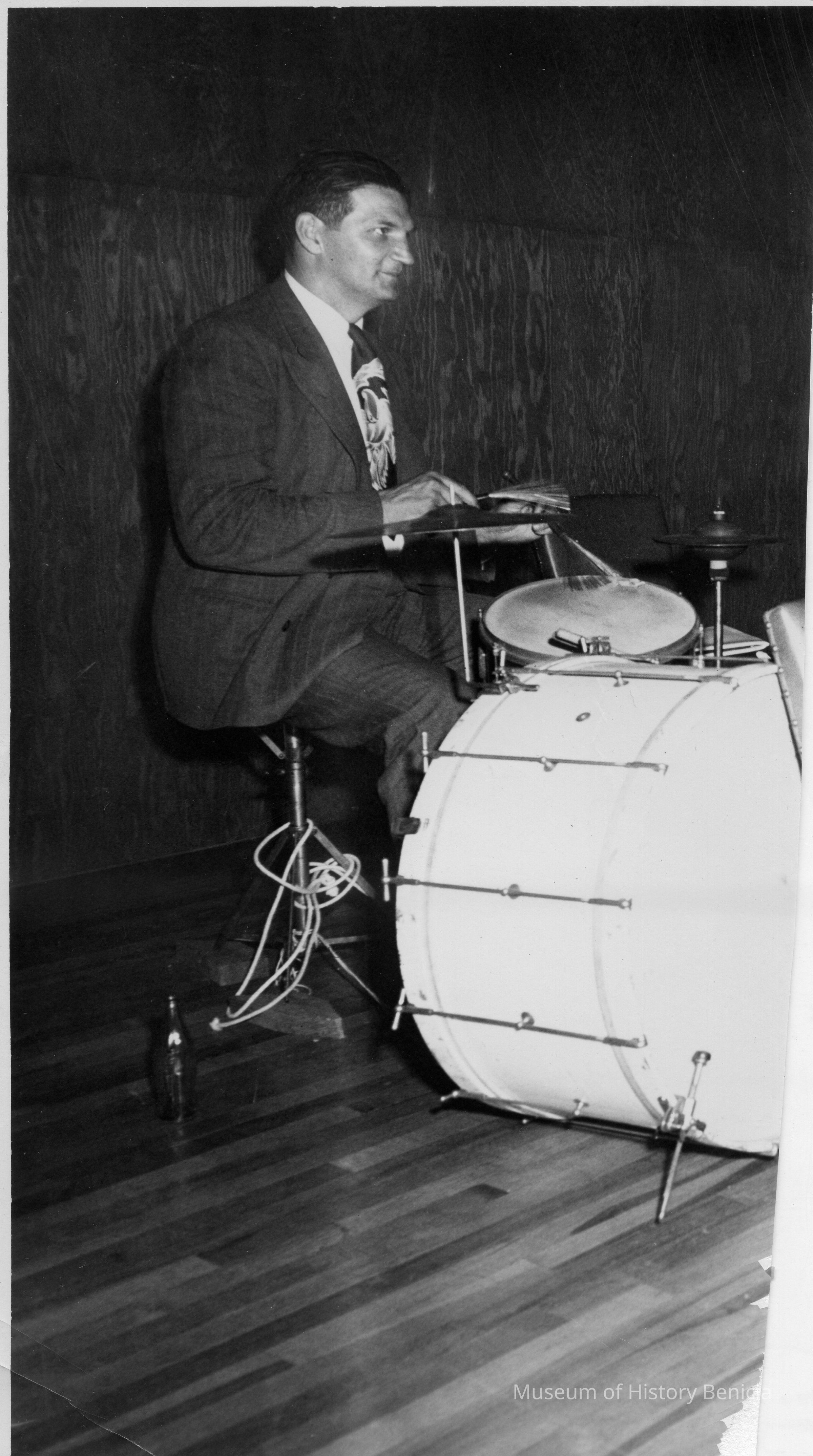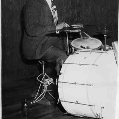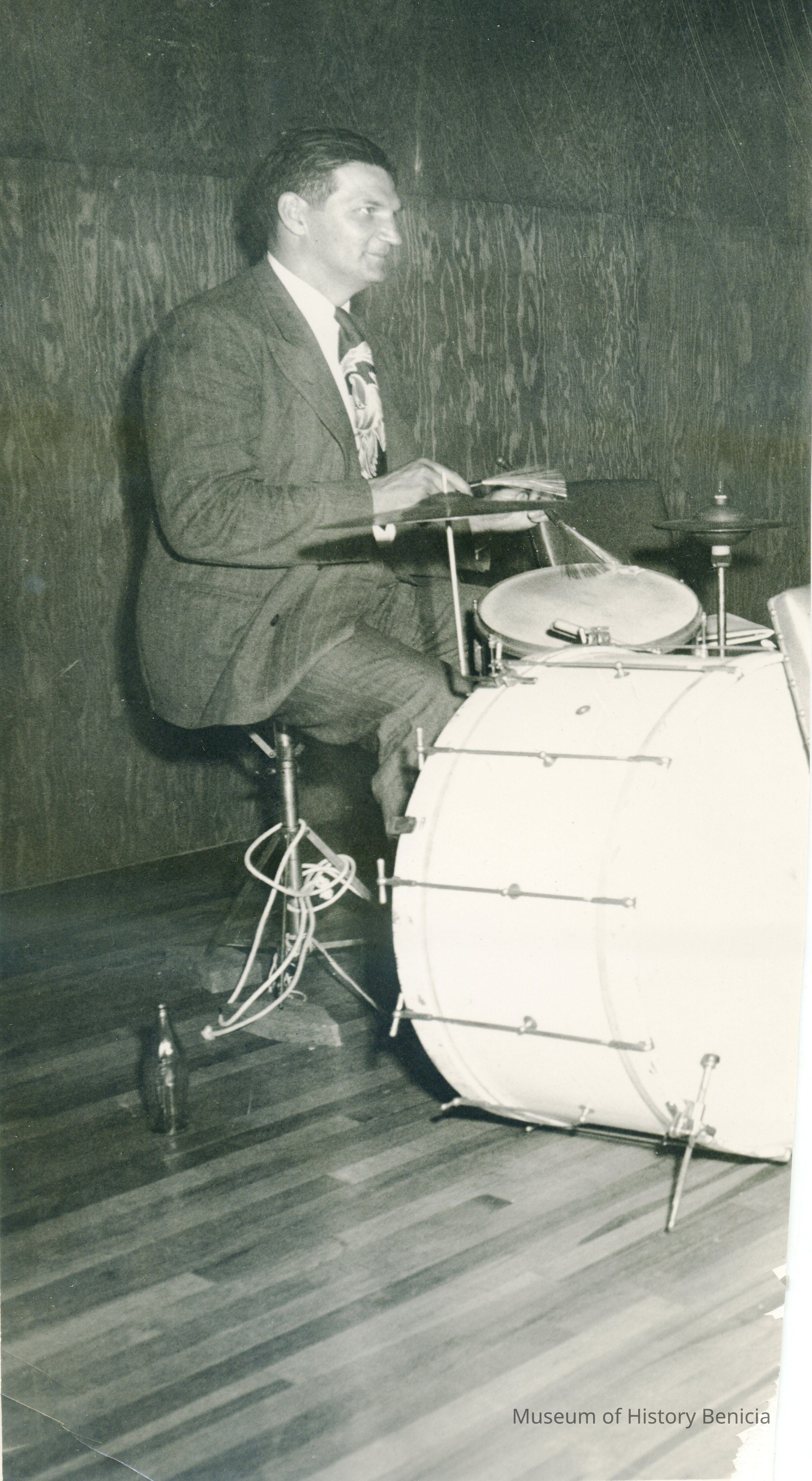 This is a photograph of Nicola Biedoff the Benicia schools music teacher playing the drums. It is an 8 x 10 photo cut in half.