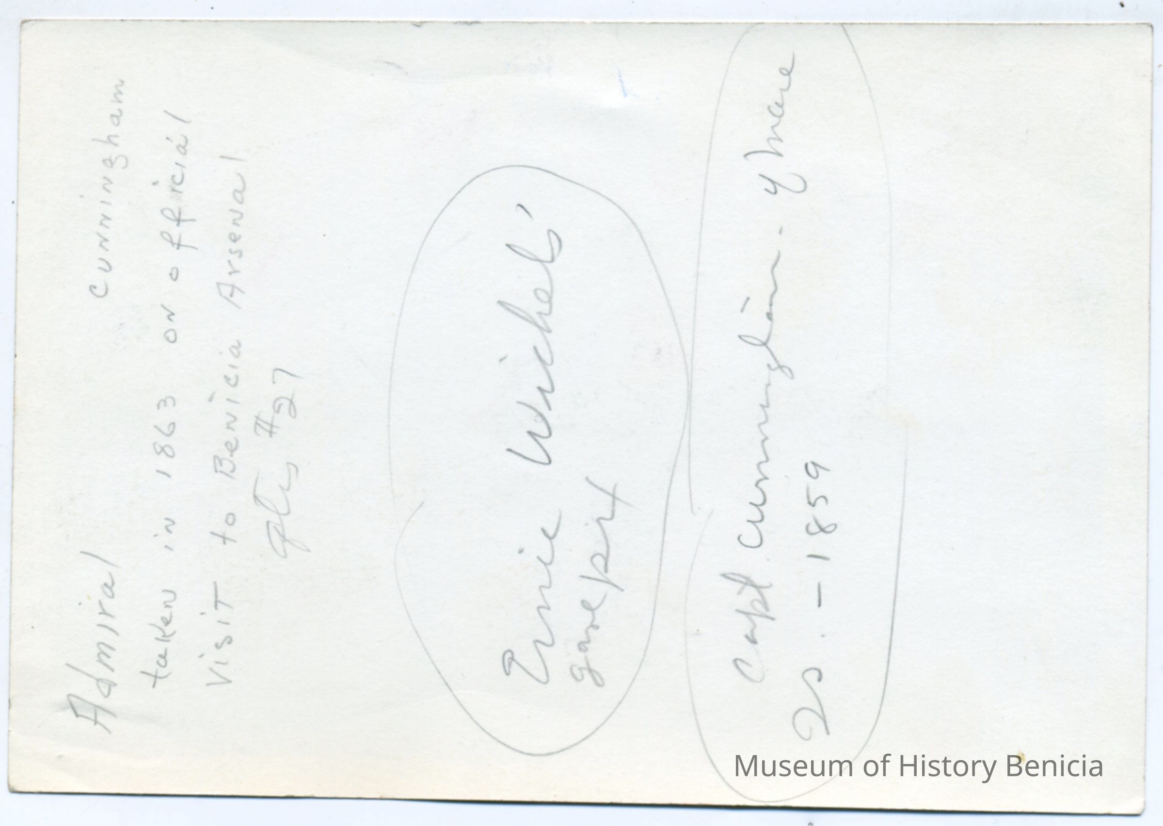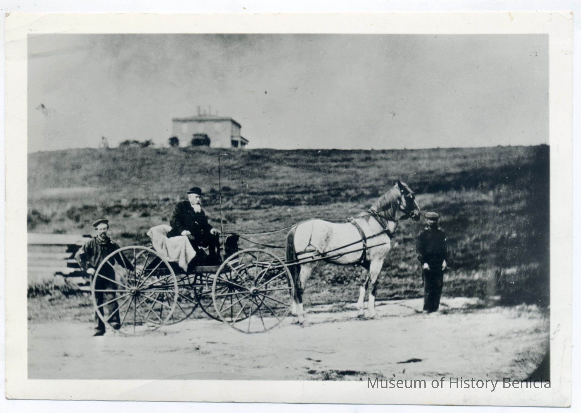 Photograph of Admiral Cunningham on official visit to the Benicia Arsenal taken in 1863. The Admiral is in a horse-drawn carriage accompanied by two men.