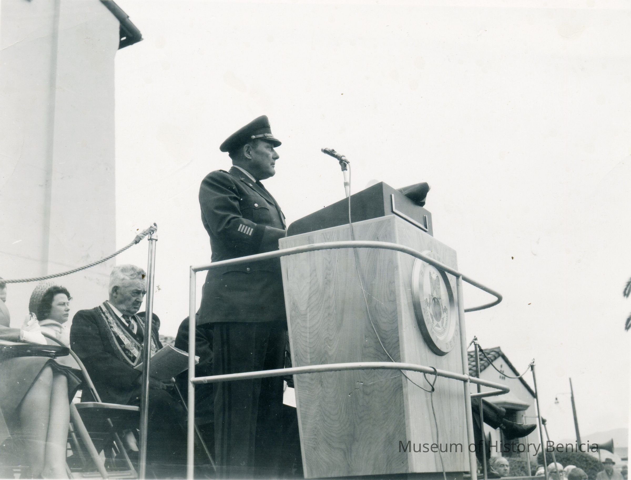 This is a photograph of a man in uniform giving a speech at the Benicia Arsenal. Just behind him is Jack O'Grady with a fraternal order collar around his neck. The back shows Stephen DeBenedetti's name as owner of the photo.Collection