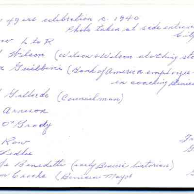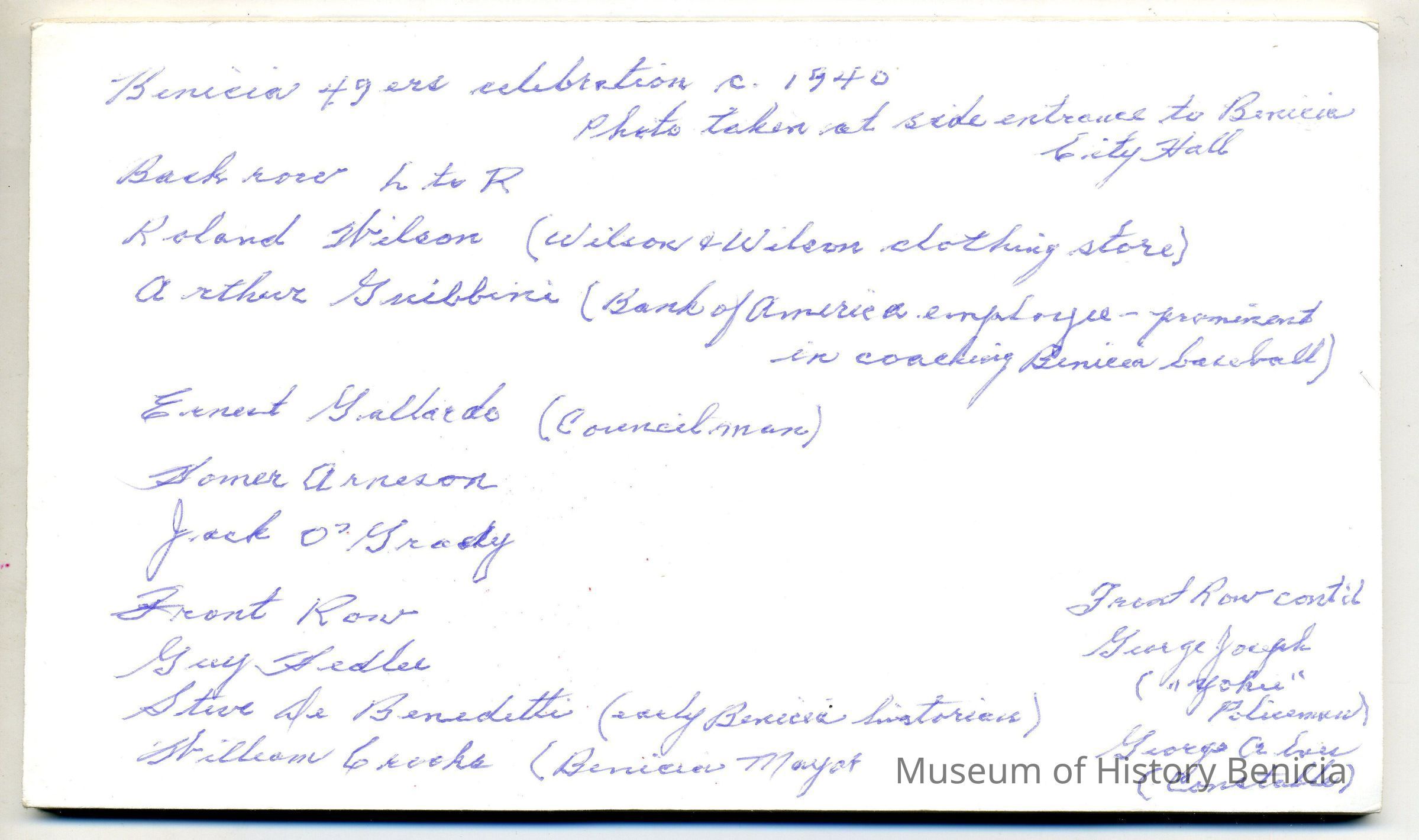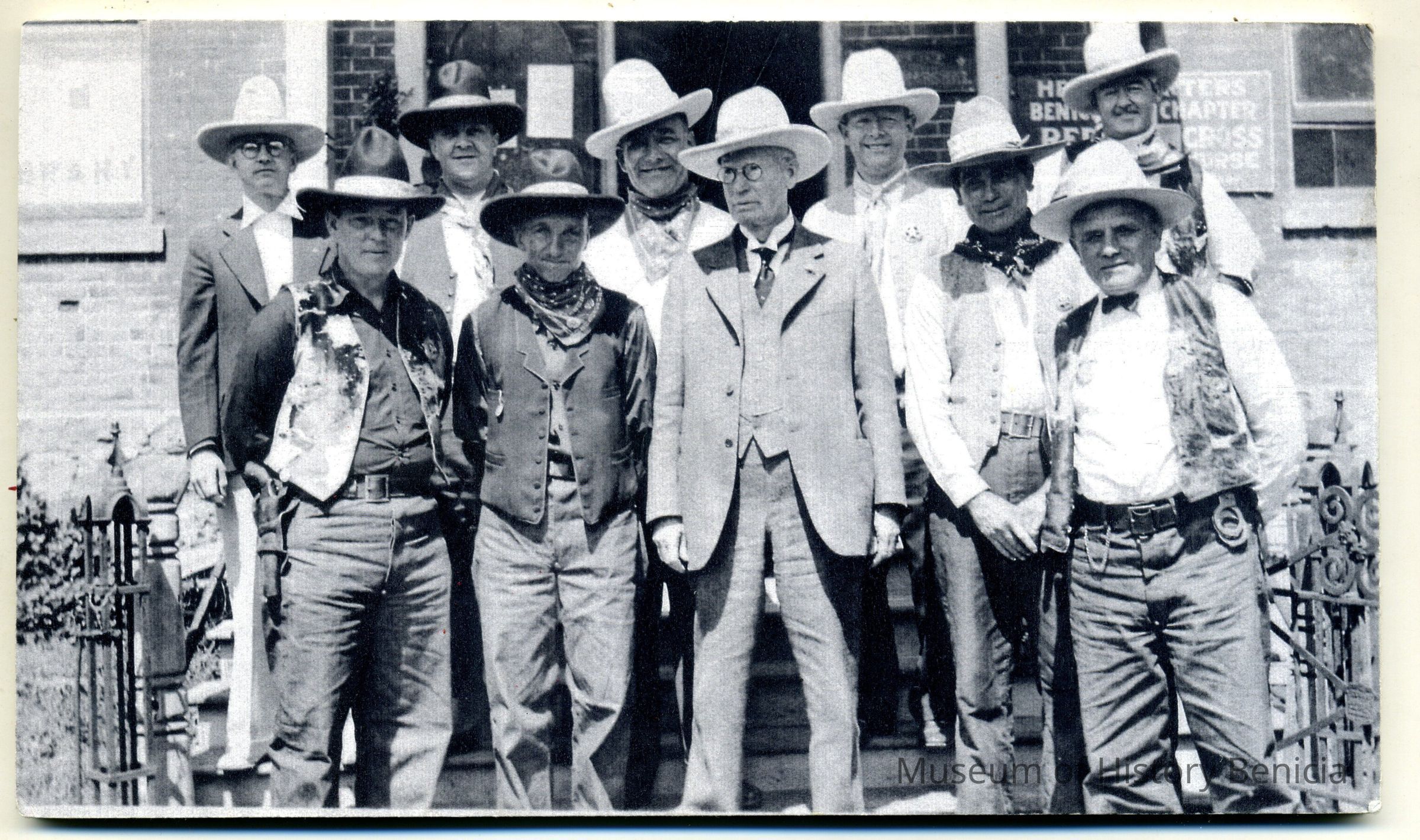 Photo mounted on foam board: Benicia 49ers celebration c1940. Photo taken at side entrance to Benicia City Hall (State Captal Building). 7 1/4" x 4 1/4". Other copy of this photo shows a date of 09/14/1935.)