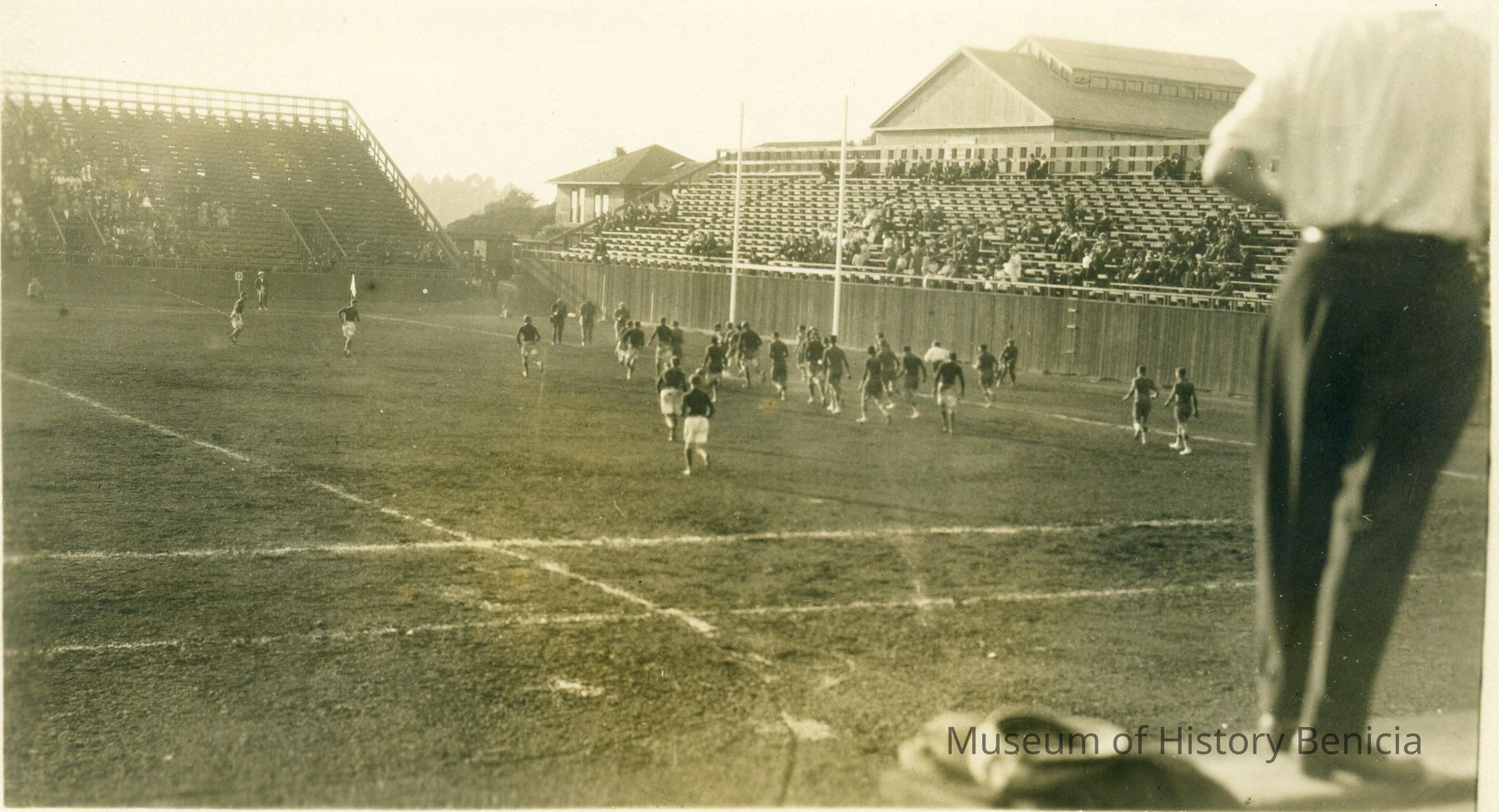 This is a photograph of a soccer match. Looks to be about 1910's. Crowd is in the stands so it might be a college match. Buildings in the background look like a campus. Men at the far end seem to be photographers.Collection