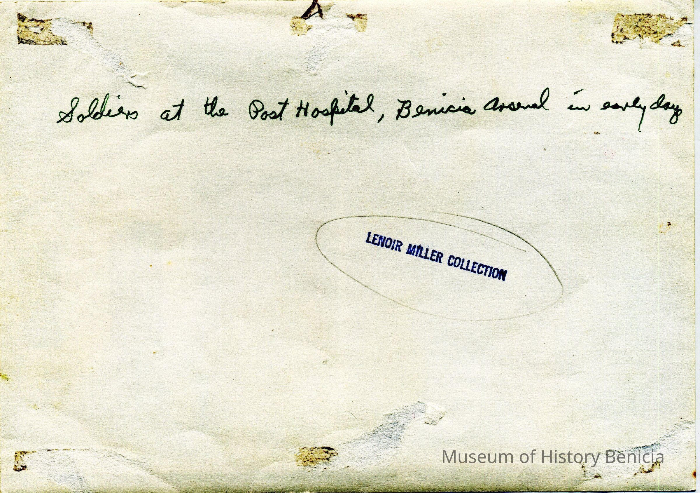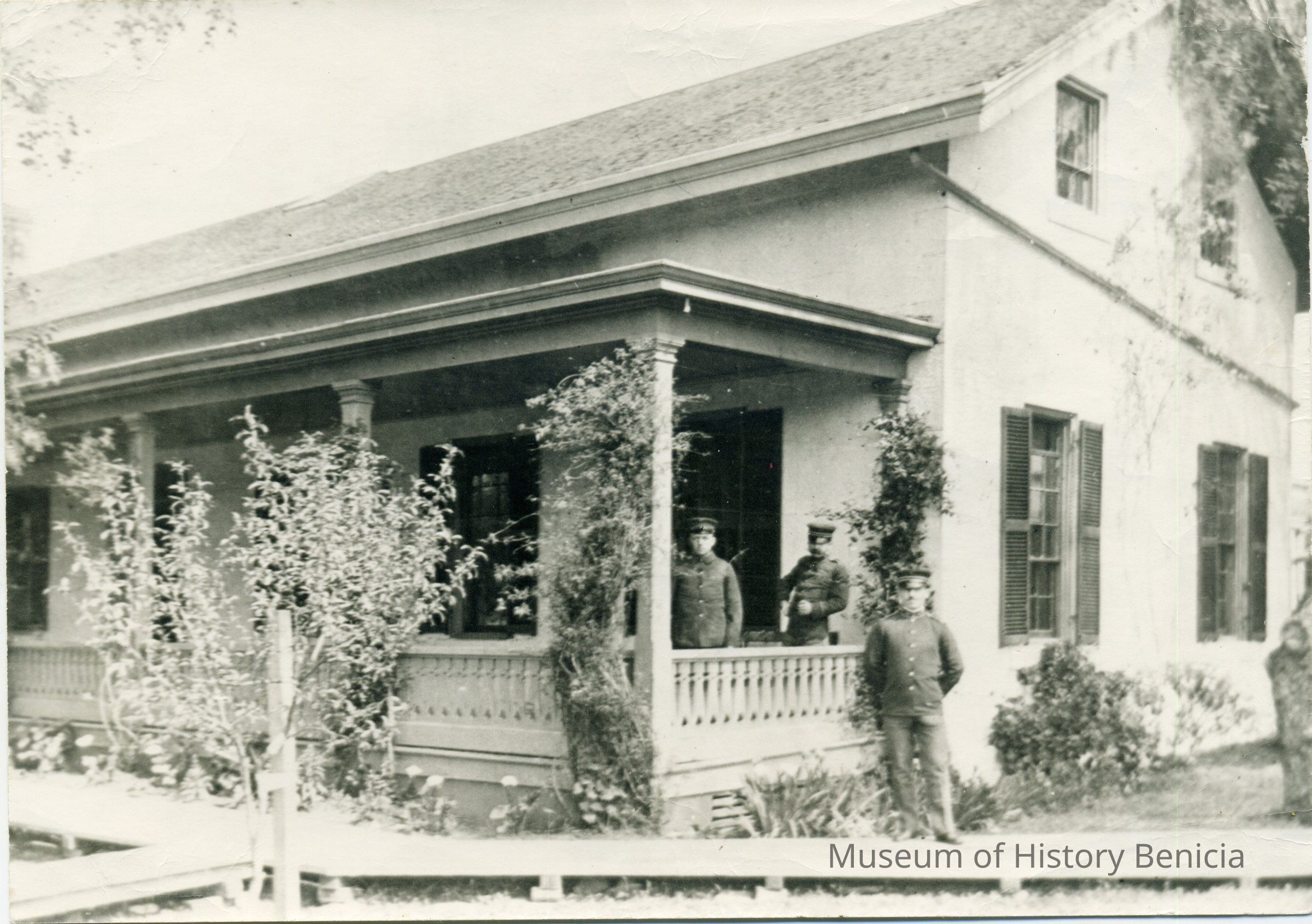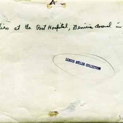 This photo shows the Arsenal Hospital in Benicia with several soldiers standing around.