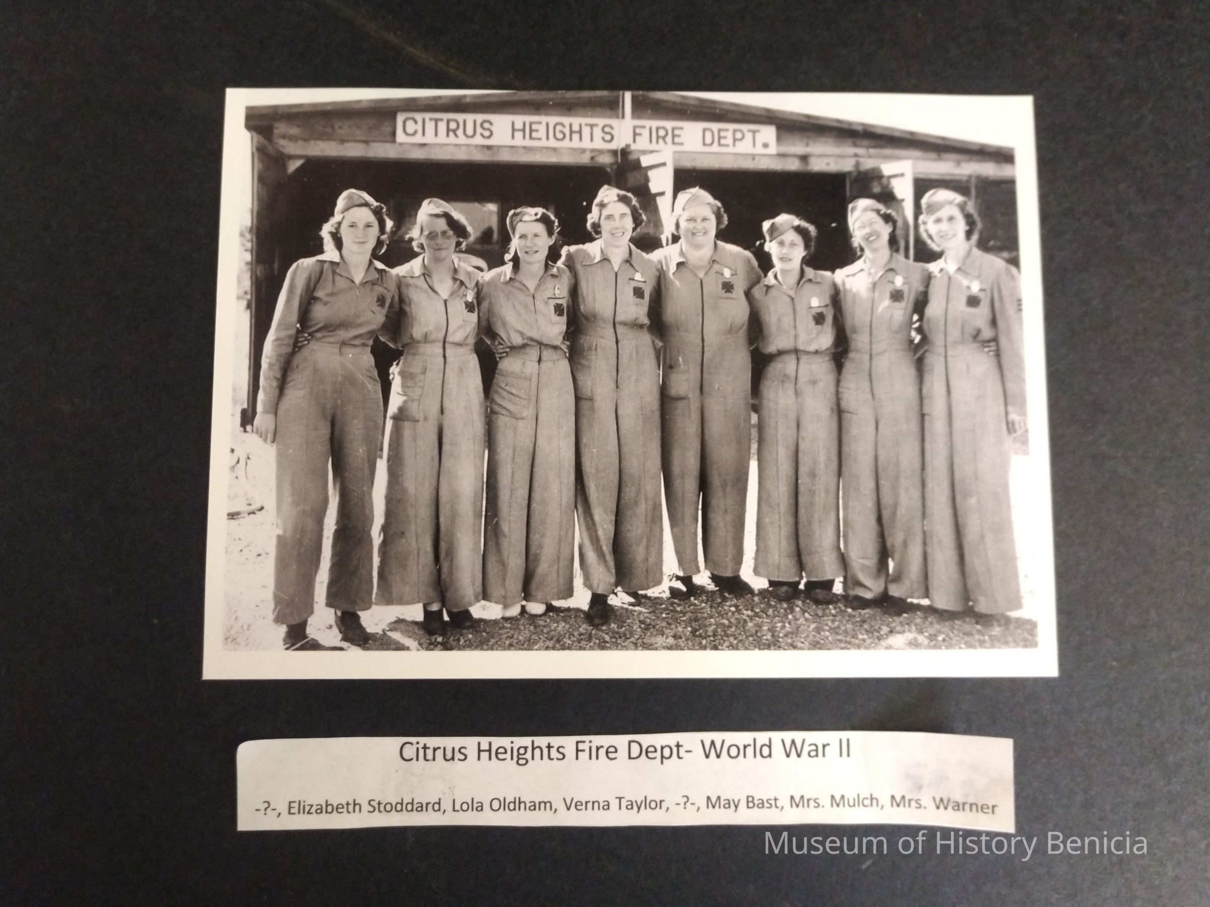 Cirtus Hights Fire Department - WWII - Women's names listed on tag from frame - "-?-, Elizabeth Stoddard, Lola Oldham, Verna Taylor, -?-, May Bast, Mrs. Mulch, Mrs. WarnerCollection