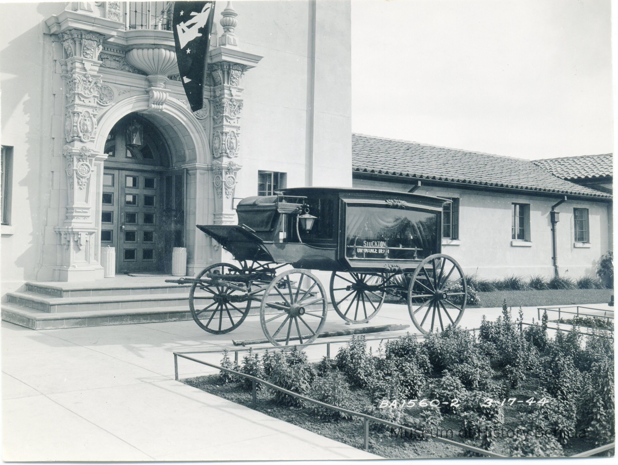 This is a photograph of a hearse outside a building. The date on the photo is 03/17/1944. There are no horses attached to the hearse. It is just standing as if on display. It has long glass windows and a carriage light on the side. Inscribed on the window is "Stockton" "Ordnance Dept.". This must belong to the Stockton Army Depot.Collection