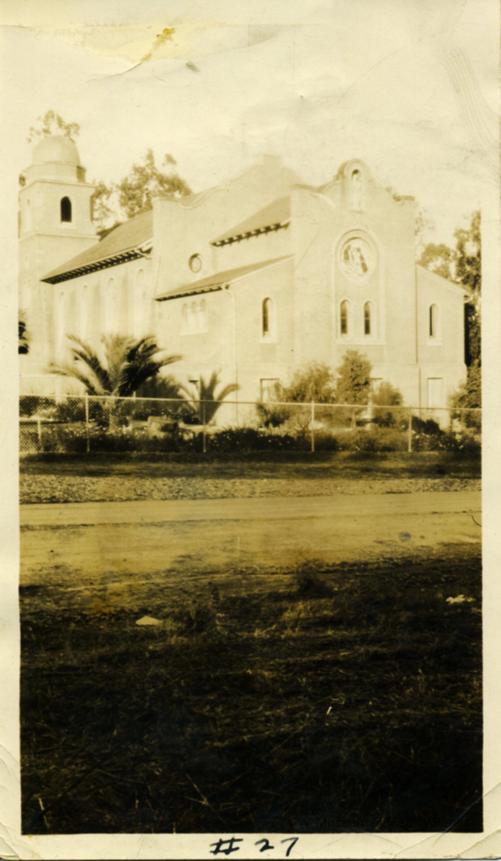 Photo of St. Catherine's Chapel taken from the other side of a fence. Plants surround the muti-level intricate building. Appears to be circular stain glass windows with two figures. White border around photo.Collection