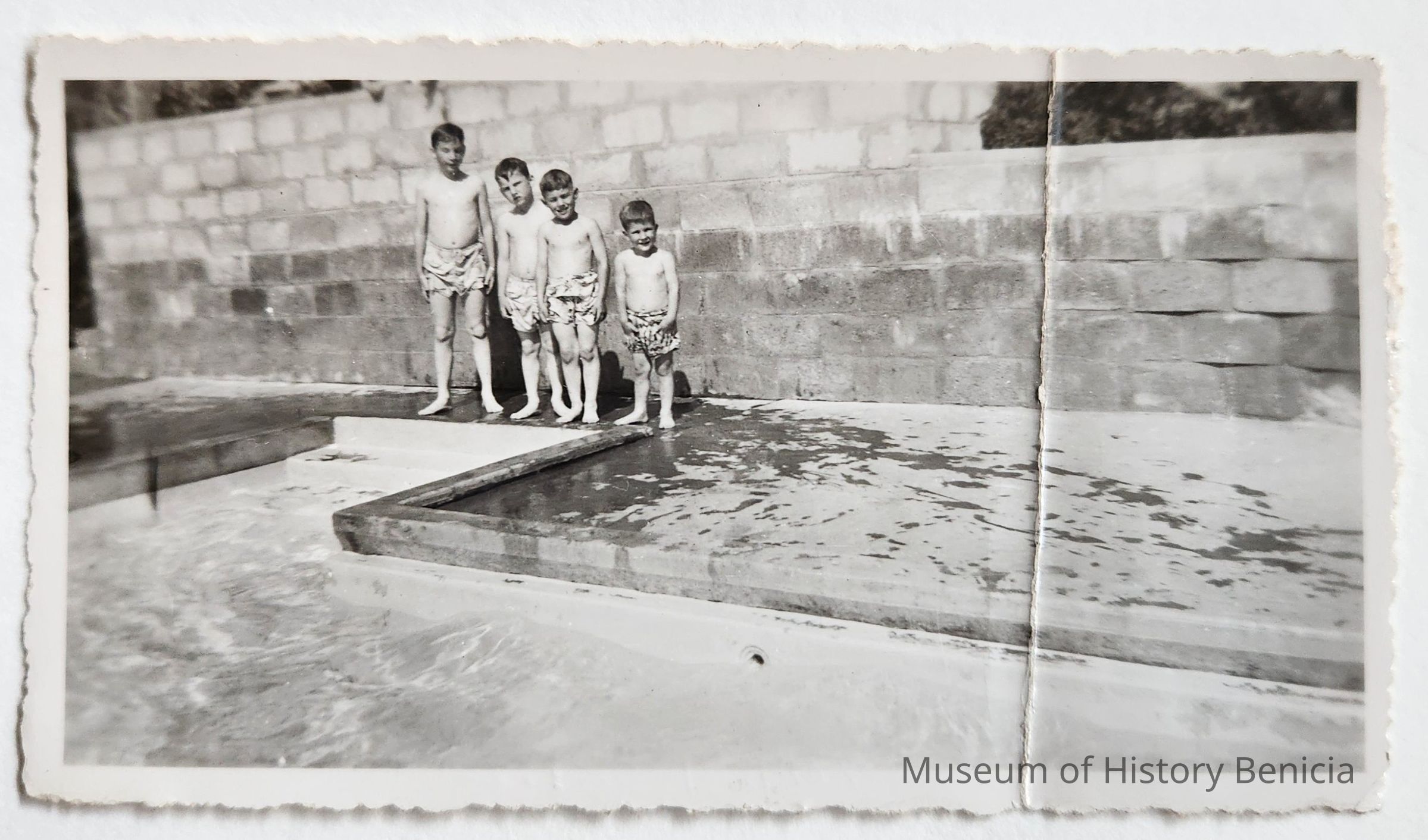 B/W Photograph of four boys at a swimming pool. The boys names and the location are unknown.