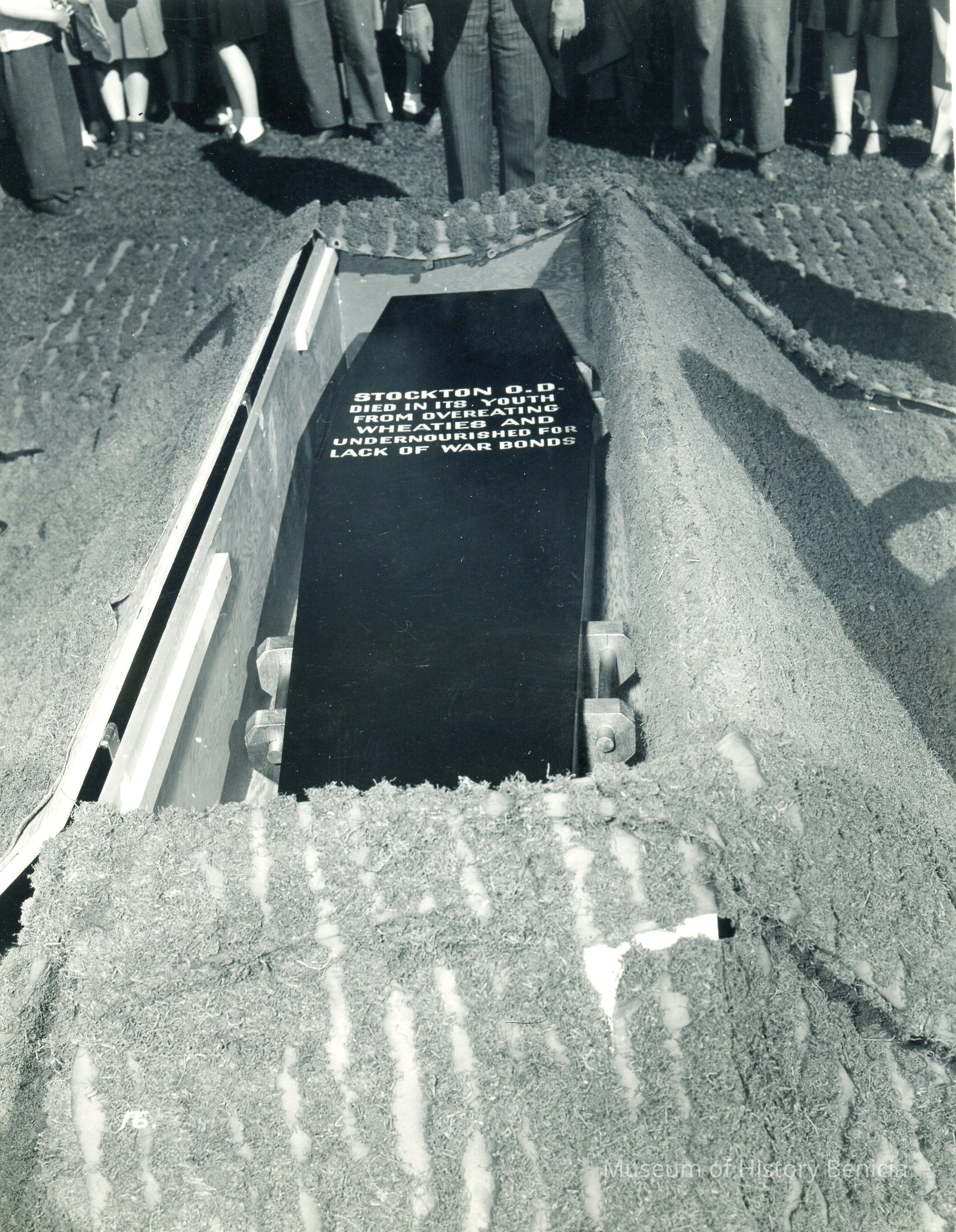 This is a photo of a ceremonial burial having to do with War Bonds. The inscription on the coffin says: Stockton O.D. (Ordnance Depot) died in its youth from overeating Wheaties and undernourished for lack of War Bonds".Collection
