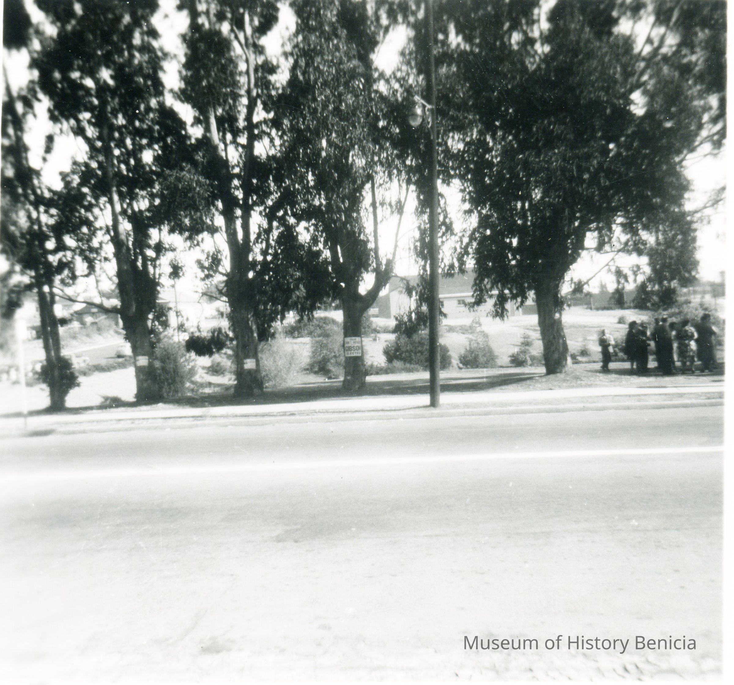 This is a photo of a group of people next to the road. Not sure what they are doing. There is an election sign for "Gibso" on a tree near the group.Collection