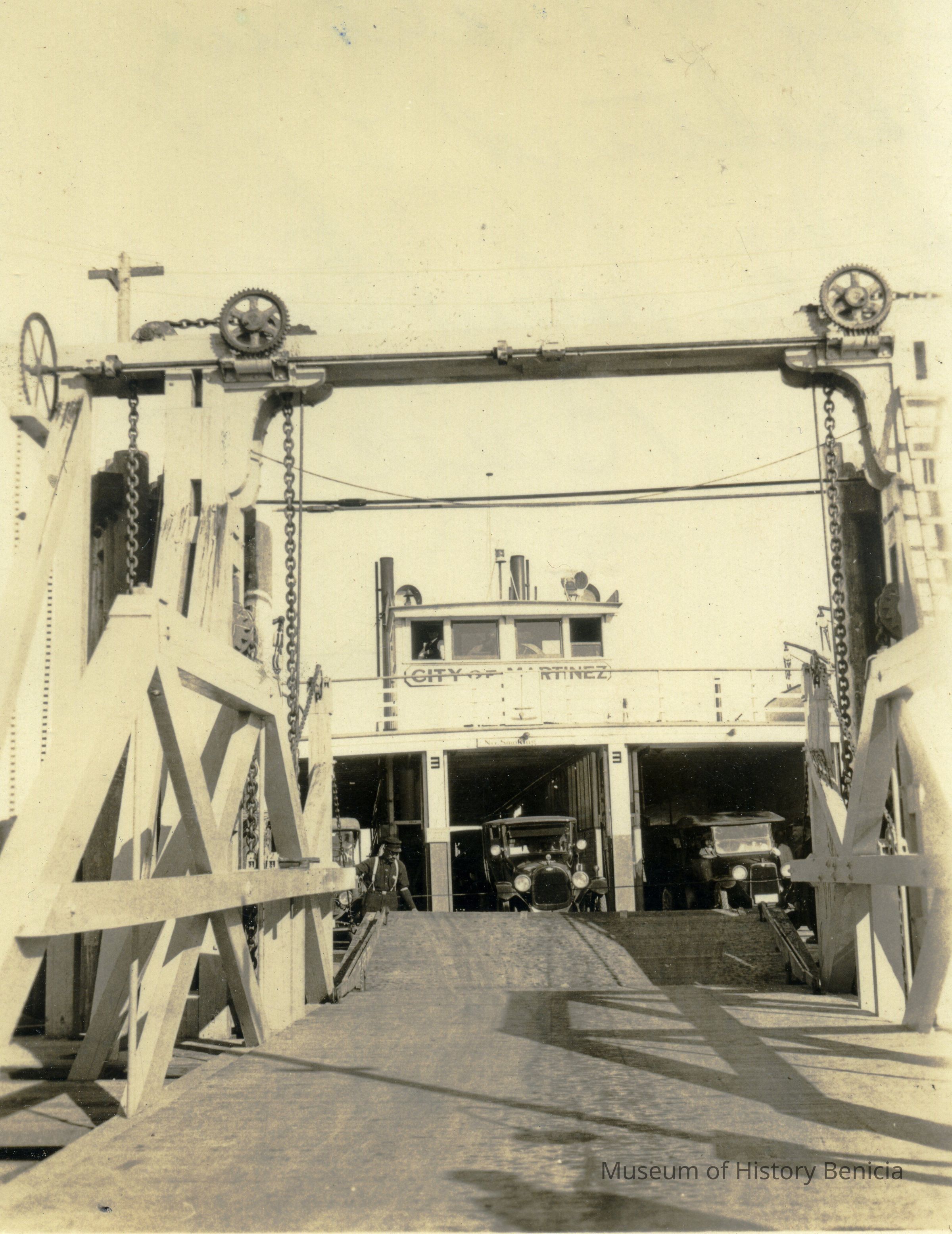 This photo is of the ferryboat City of Martinez which was christened by Lalita Eileen Sanborn of Benicia. The cars look like about 1910-1920 vintage.Collection