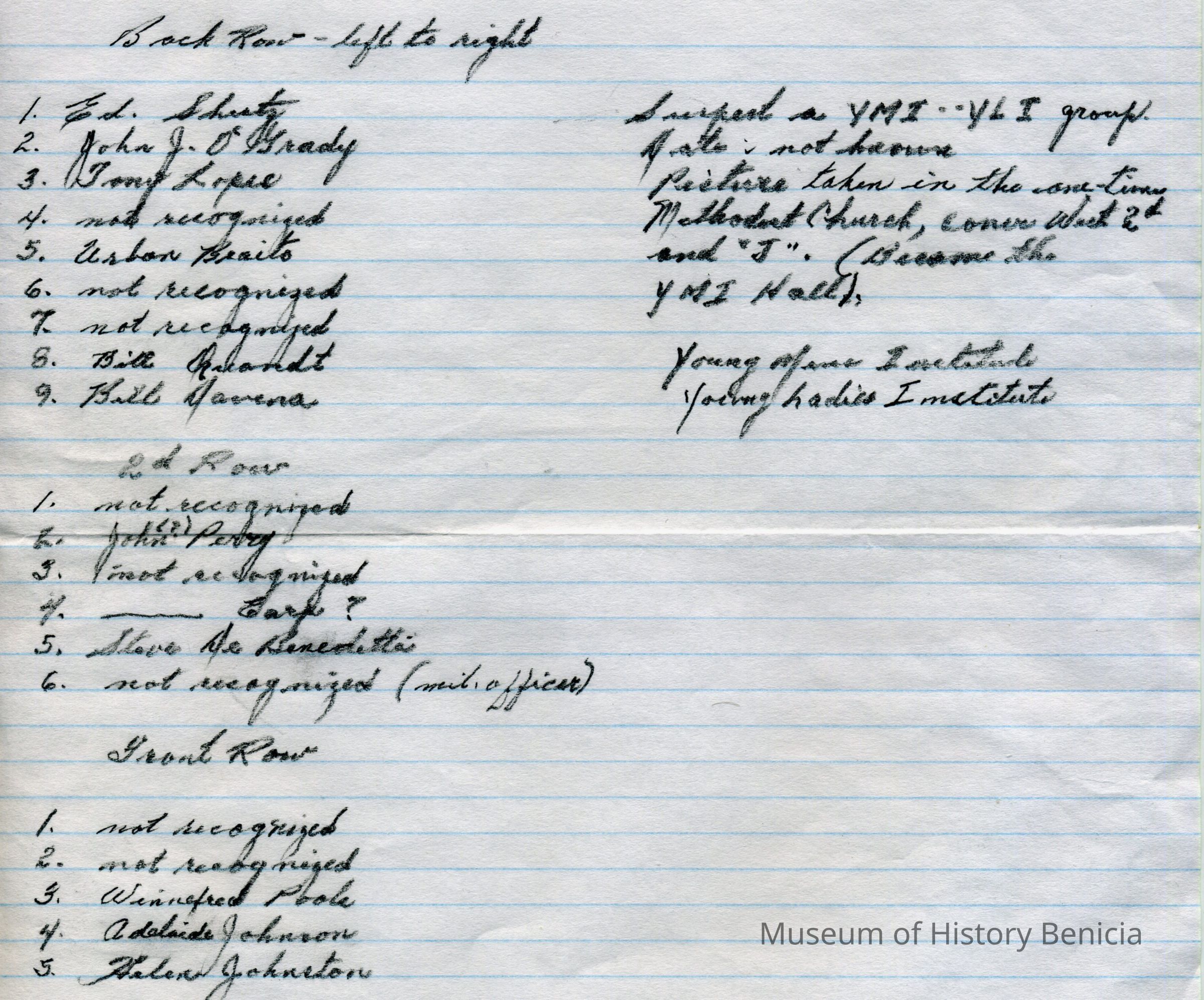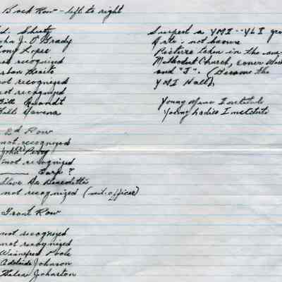 This is photograph of a group of men and women with a Y.M.I. sign in the background. Harry Wassmann has suggested that this is a combined YMI / YLI group meeting in the old Methodist Church at West 2nd and J st. which became the YMI hall.