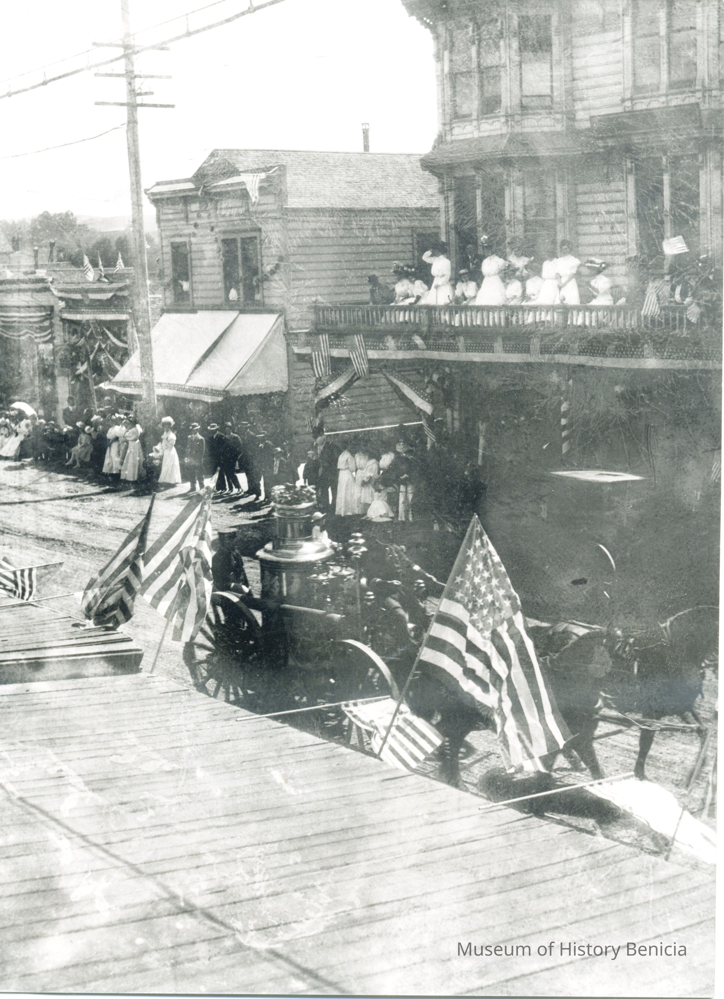 This is a photo of an early Benicia parade. It shows a fire department water wagon being pulled by horses.
