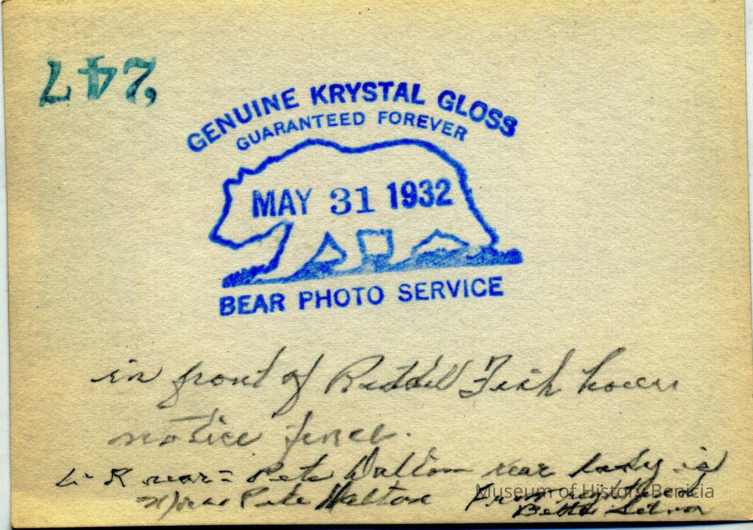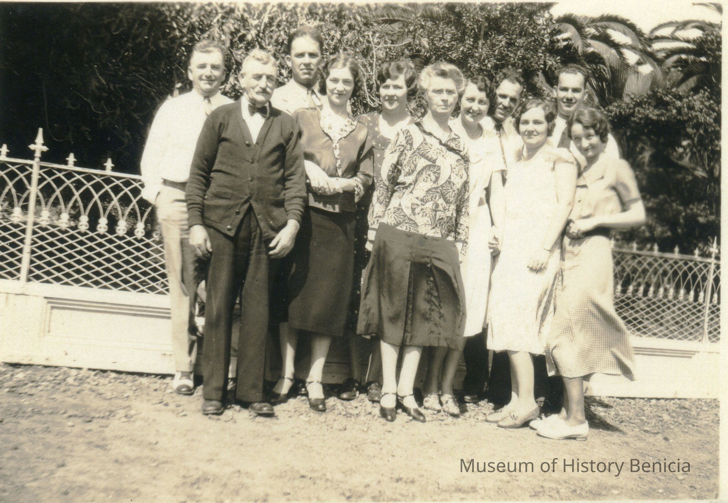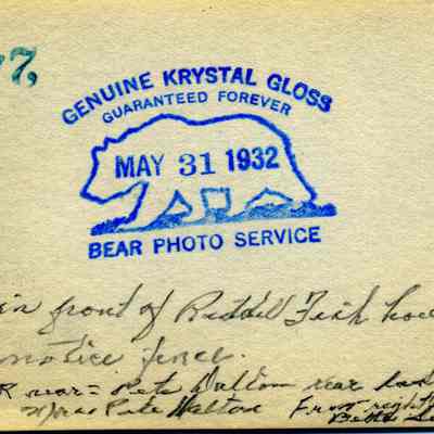 This is a photo of a group of people in front of the Riddell-Fish house. The photo is stamped Bear Photo Service and dated 05/31/1932. The people are identified as: