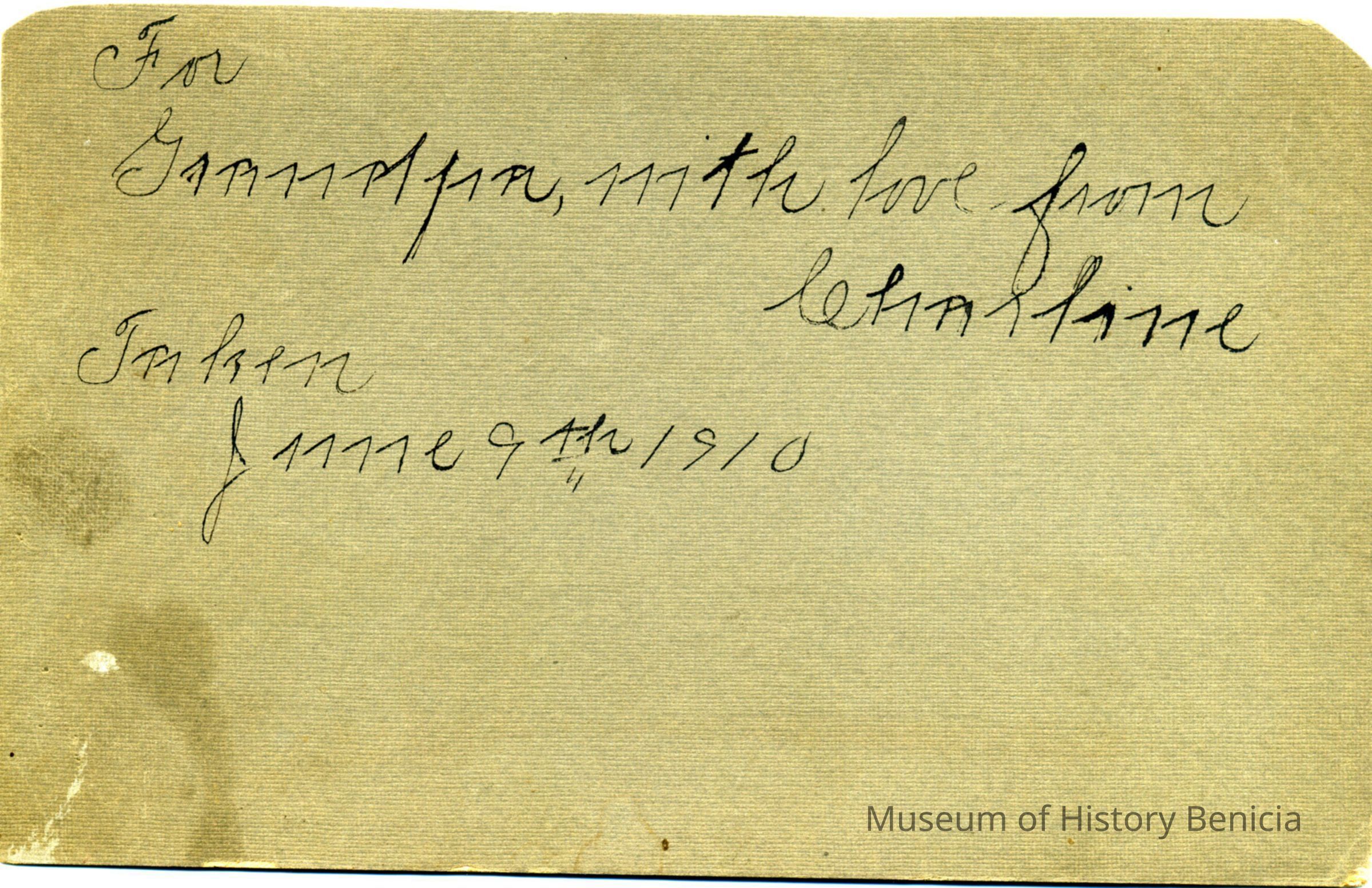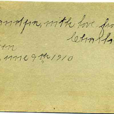 This is a photograph of a young girl sitting on a chair. The back is inscribed "For Grampa, With love from Charline" It says "taken June 9th, 1910.