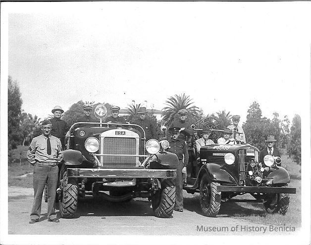 B/W Photograph of 10 men and 2 fire engines - Benicia Arsenal related