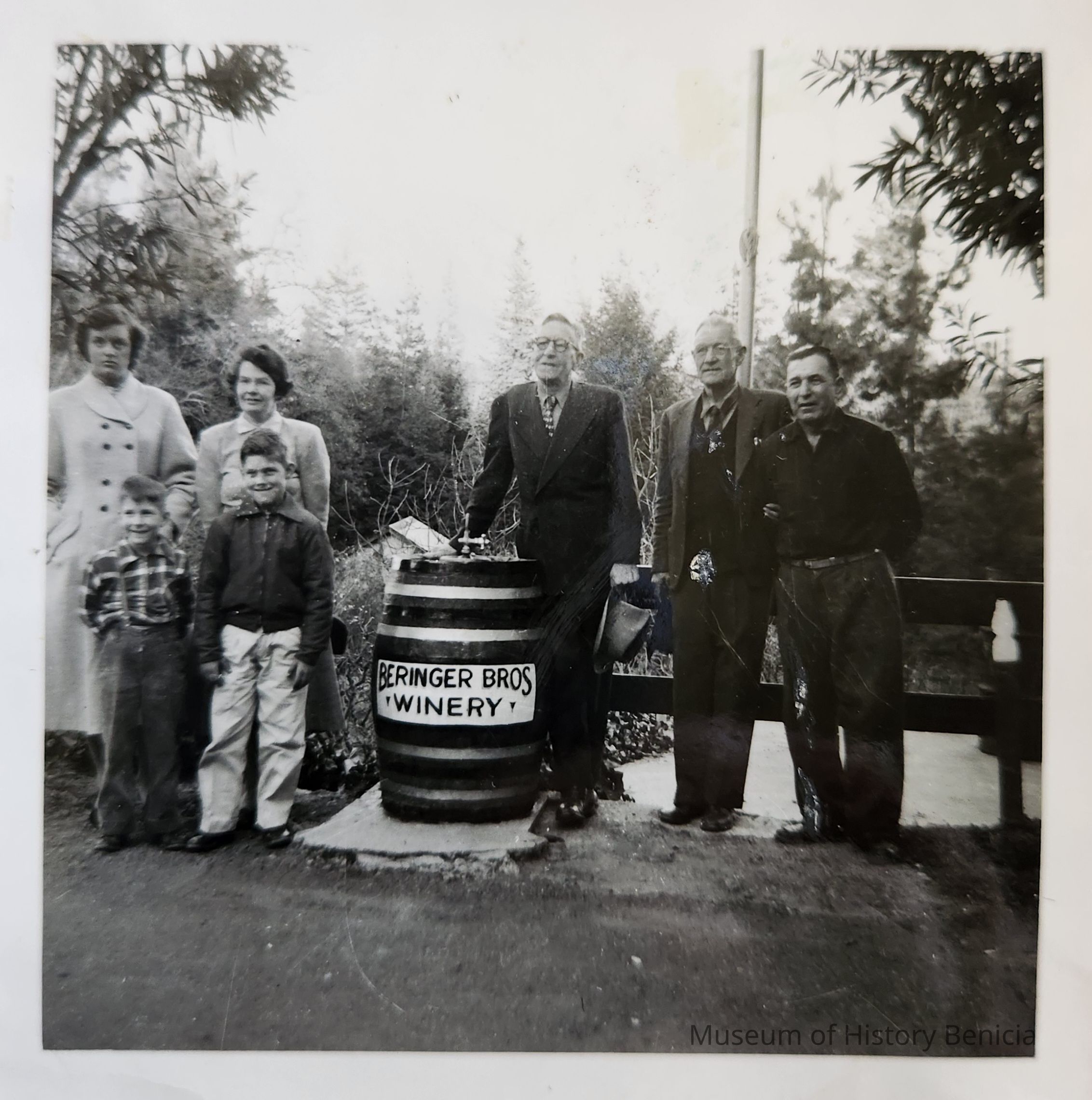B/W Photograph of two women, three men and two boys. The woman second from left is Alice Rankin and the boys (L-R) are David Henderson and Ed Rankin. It was taken at the Beringer Brothers Winery in the early 1950's..Collection