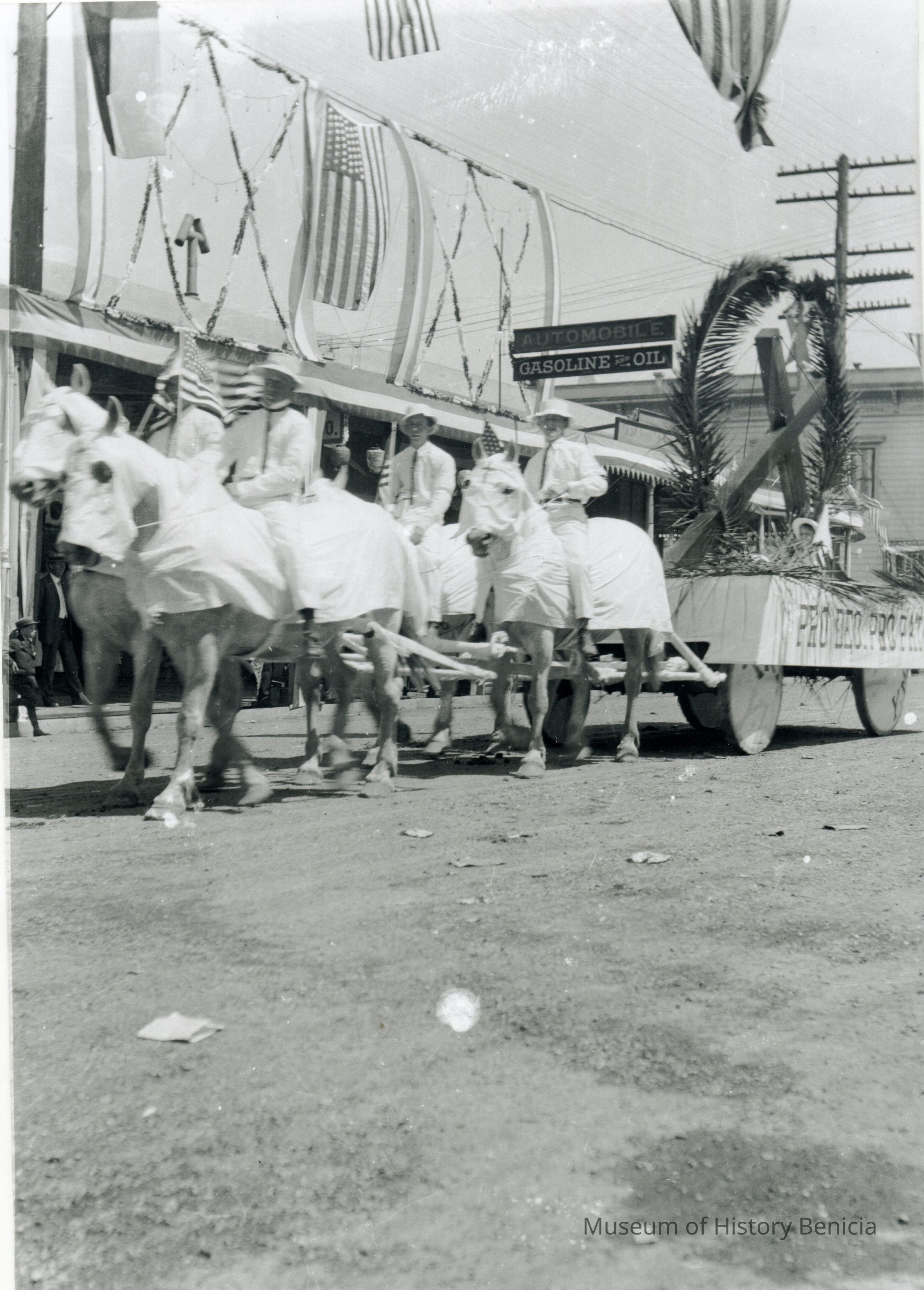 This is a photo of an early Benicia parade. It shows horses covered in sheets with riders wearing white shirts and pulling a wagon with a cross. The side of the wagon has a sign "Pro Deo Pro Patria". This is a print of the negative in 2017.030.0953.