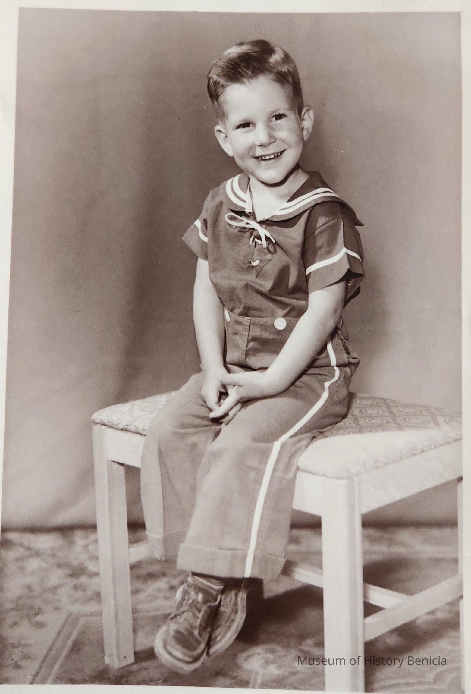B/W Studio Photograph of a young David Henderson (son of Joe and Helen Henderson) dressed in a sailor-style outfit.