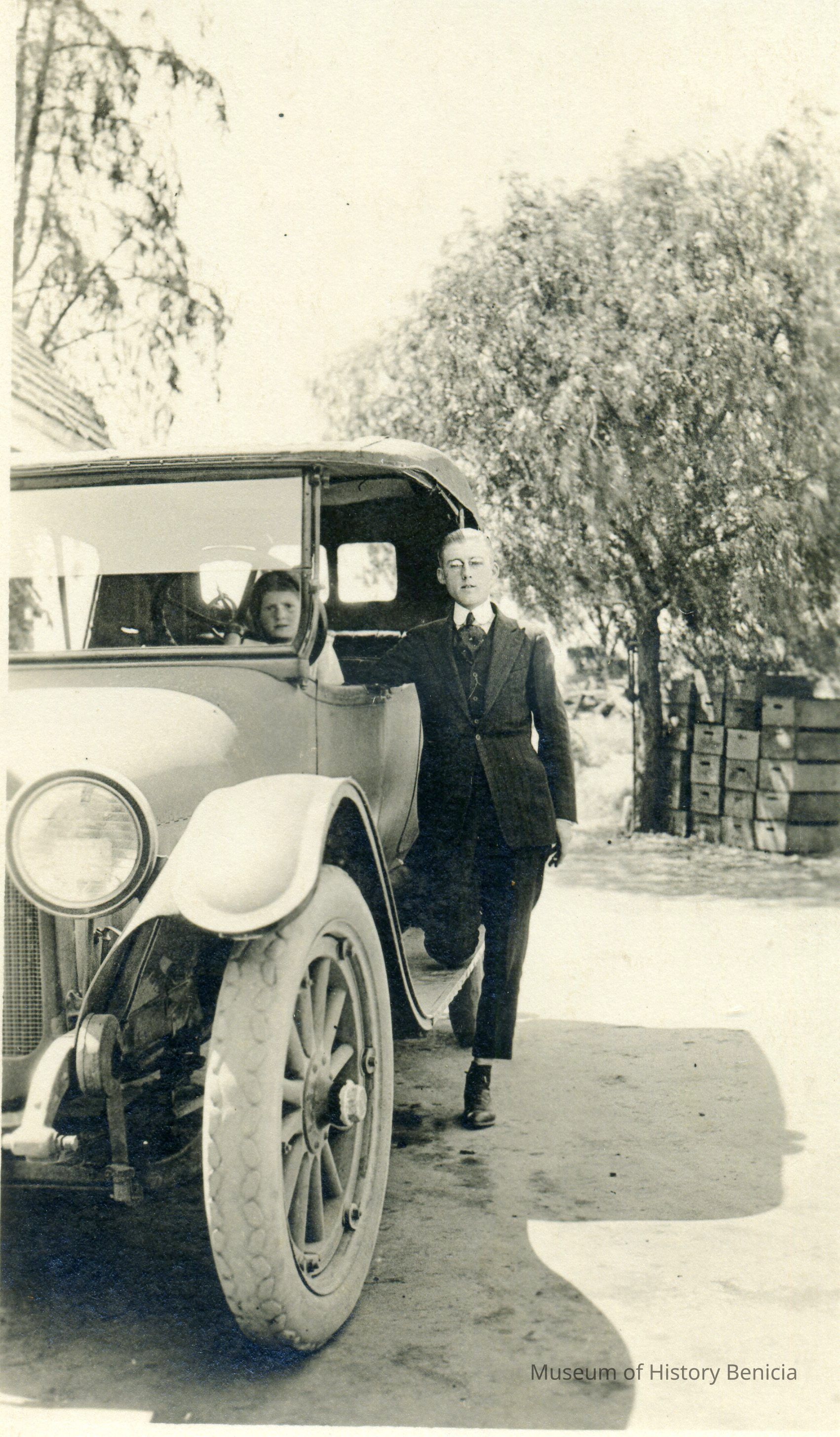 This is a photo of two people in an old roadster. The man is standing on the running board. There are fruit packing crates stacked in the back.Collection