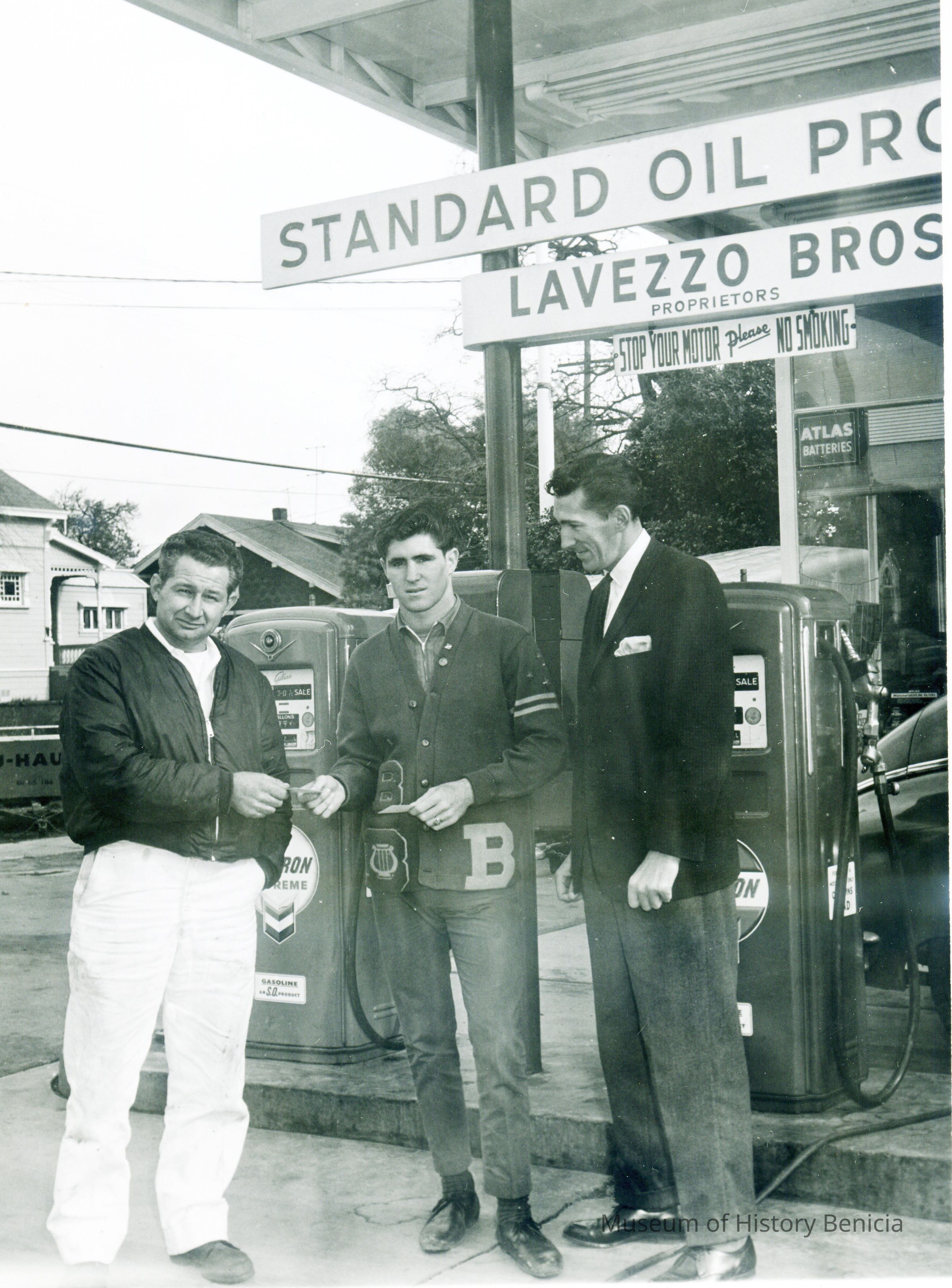 This is a photograph of the Lavezzo Brothers Chevron gas station in Benicia. It shows two men handing something to a Benicia High School student. The man on the left is Thomas Lavezzo, the young man in the middle is Doug Wingert and the man on the left is Chet Carr.Collection