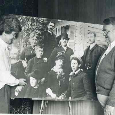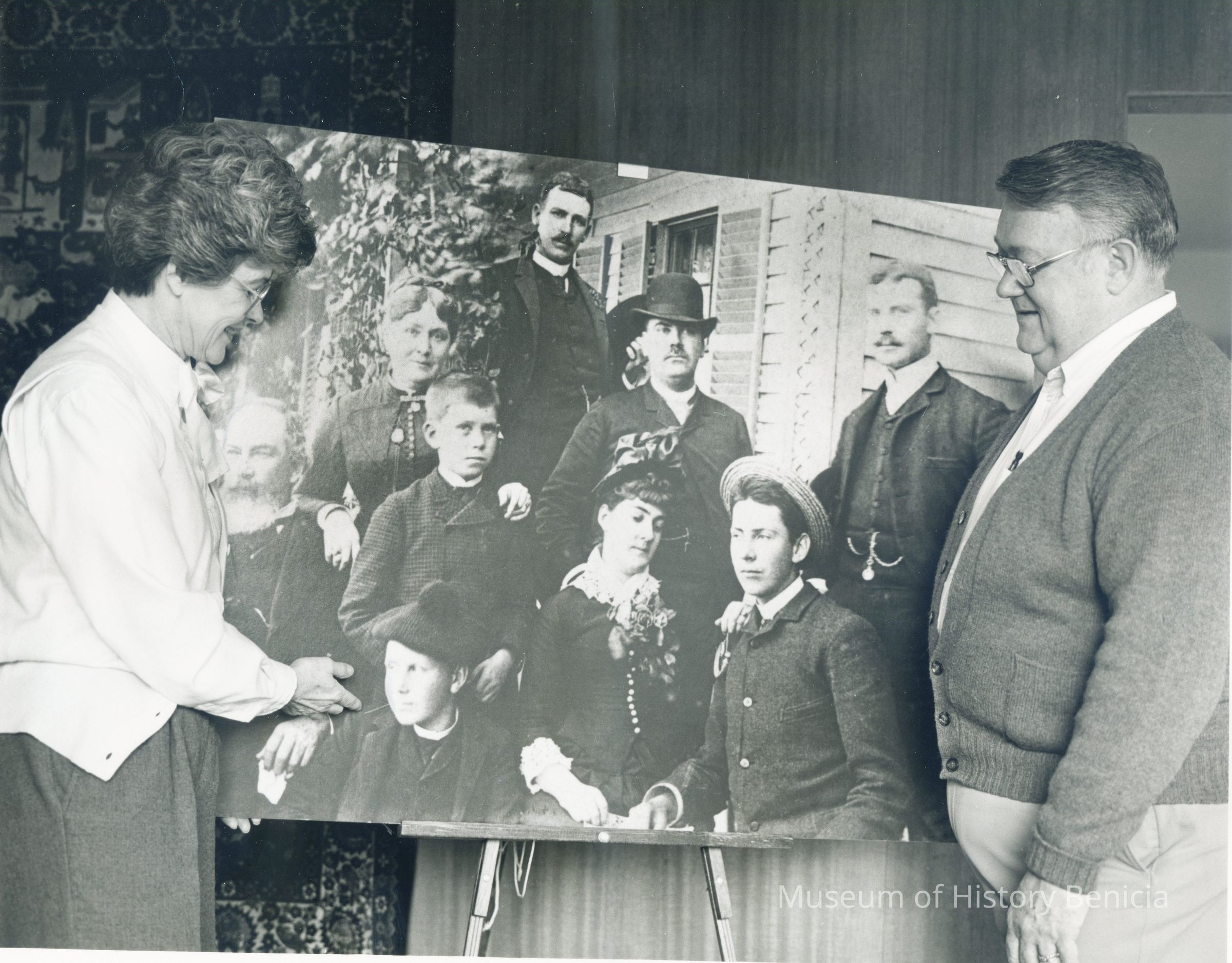 This is a photograph of .Marjorie Williford and Gerry Patten with a large photo of the Mizner family.