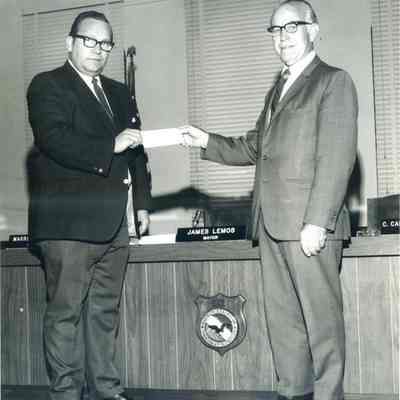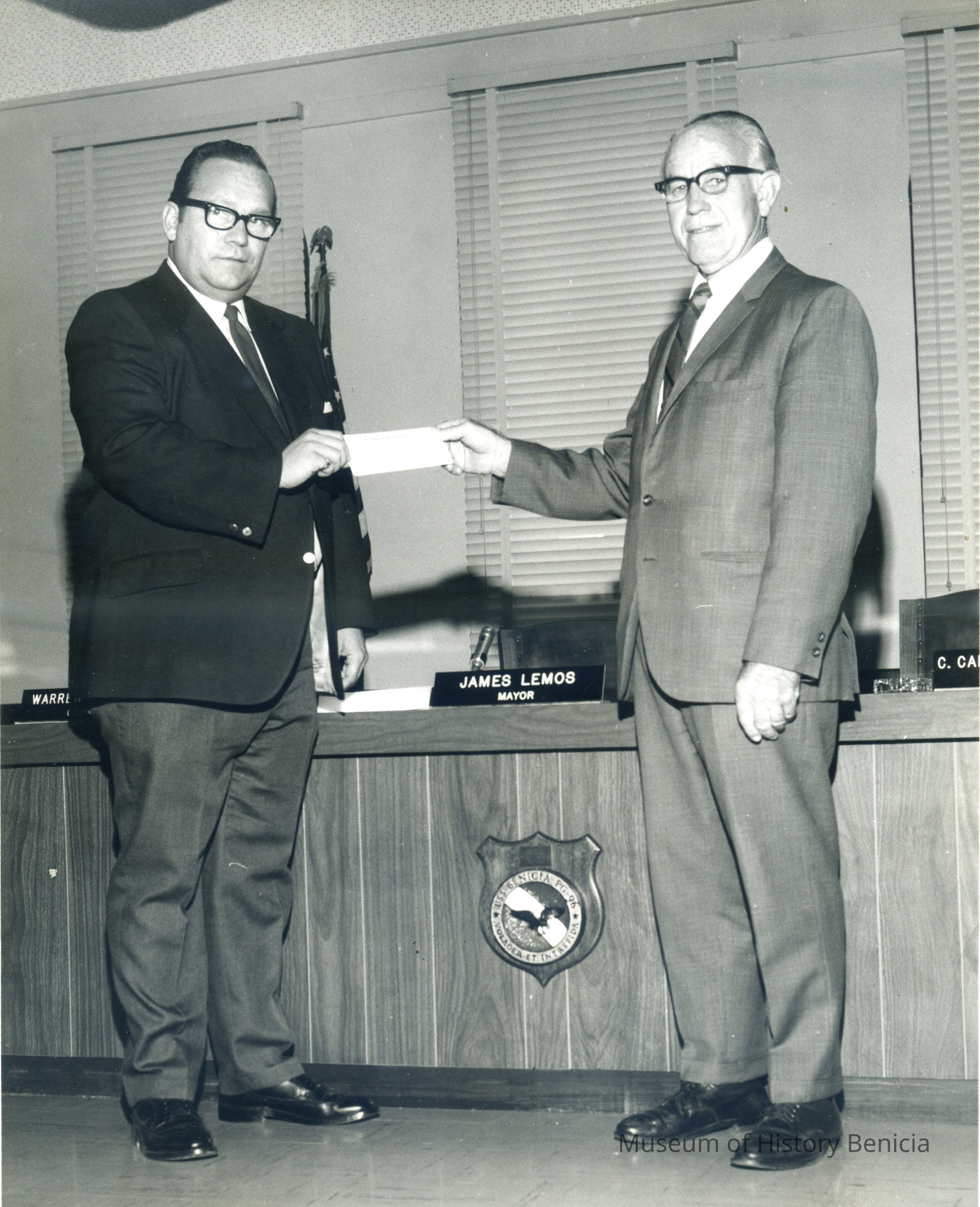 This is a photograph of two men in front of the Benicia City Council desk. There is a plaque for the USS Benicia PG-96 on the front of the desk. The back of the photo identifies the men as Lombreglia (left) and Brady (right).Collection