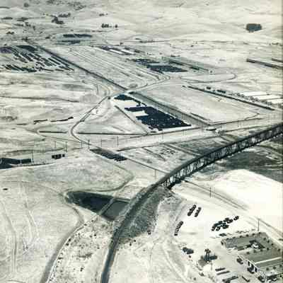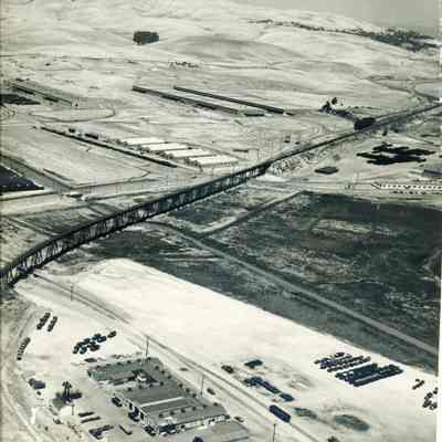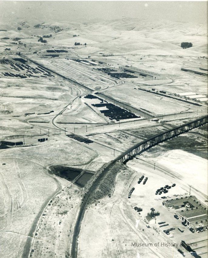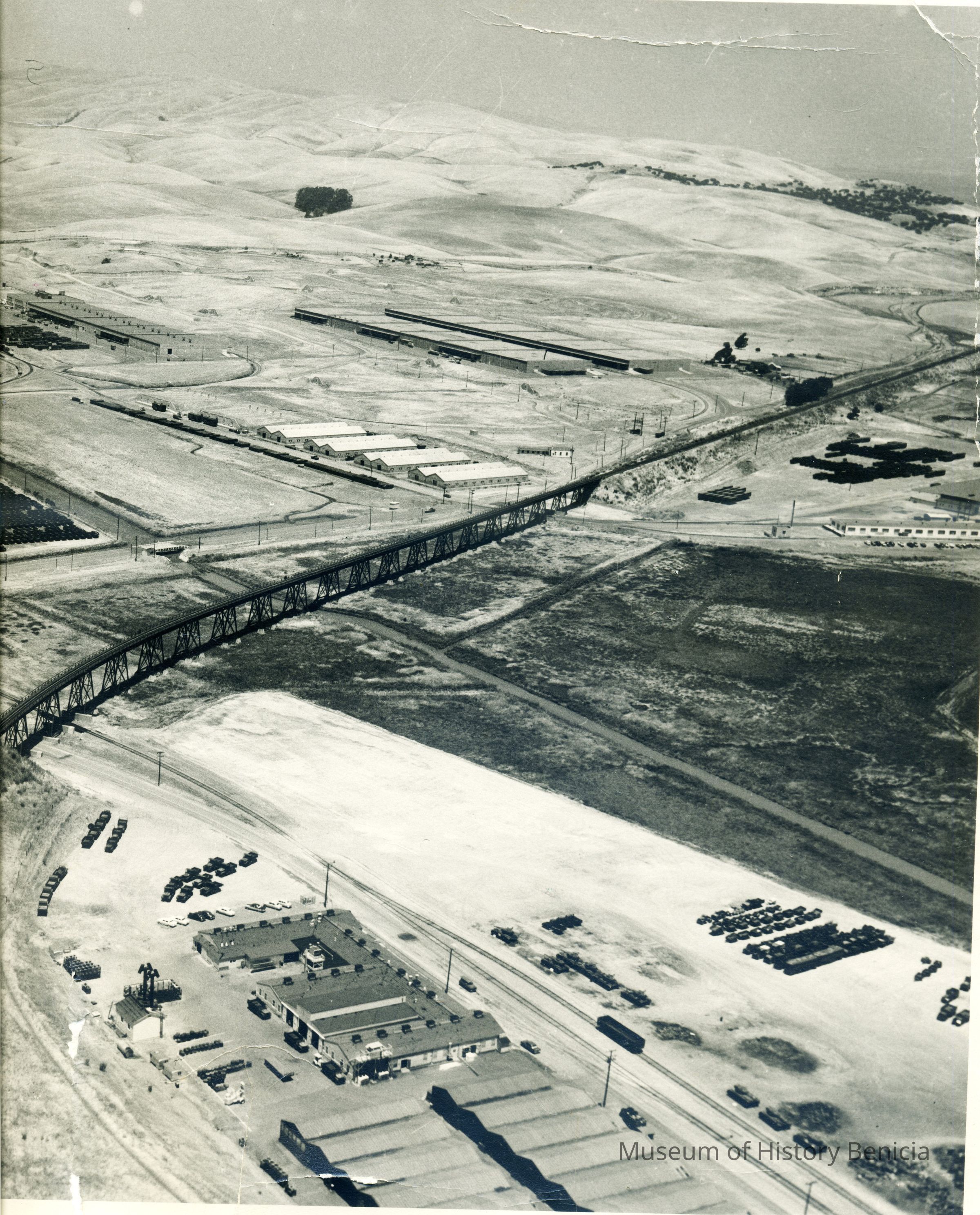 This is an ariel photo of the Benicia Arsenal from the water looking inland. It shows the railroad tracks going out over the marsh and buildings further inland. The back identifies this as an Army photo with the inscription 04071 - 110/ORD 58 No. 4.Collection