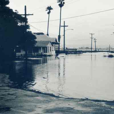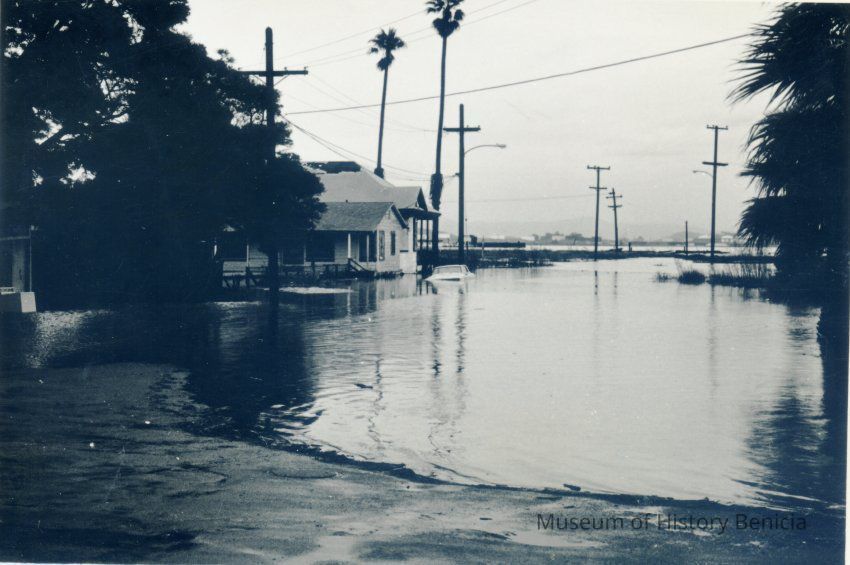 This is a photograph of Benicia flooded. You can see the car almost submerged.