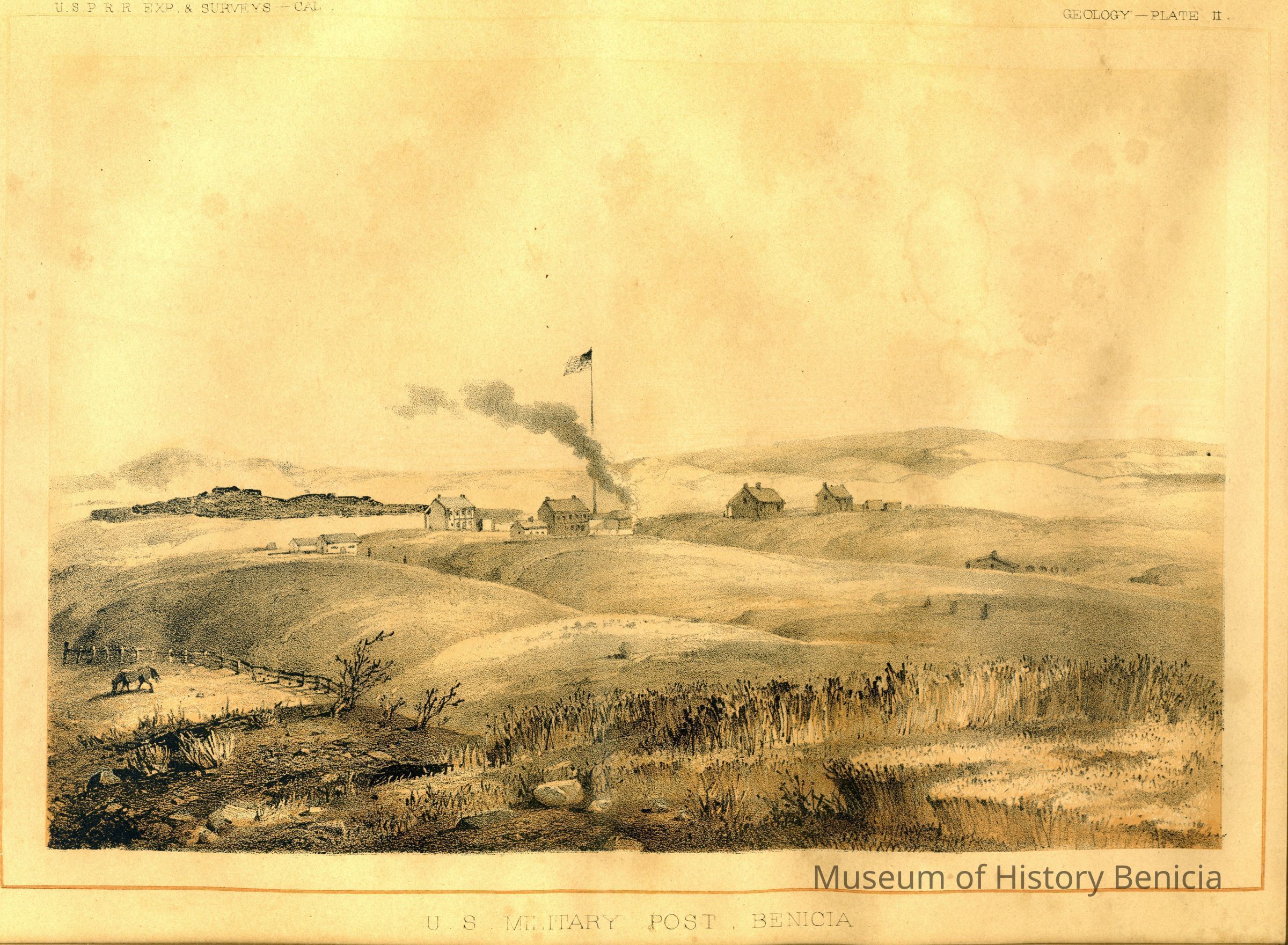 This is a copy of a lithograph of Benicia Arsenal Barracks. It was made by the U.S.P. RR Expedition and Survey of 1856. It is Geology Plate IICollection