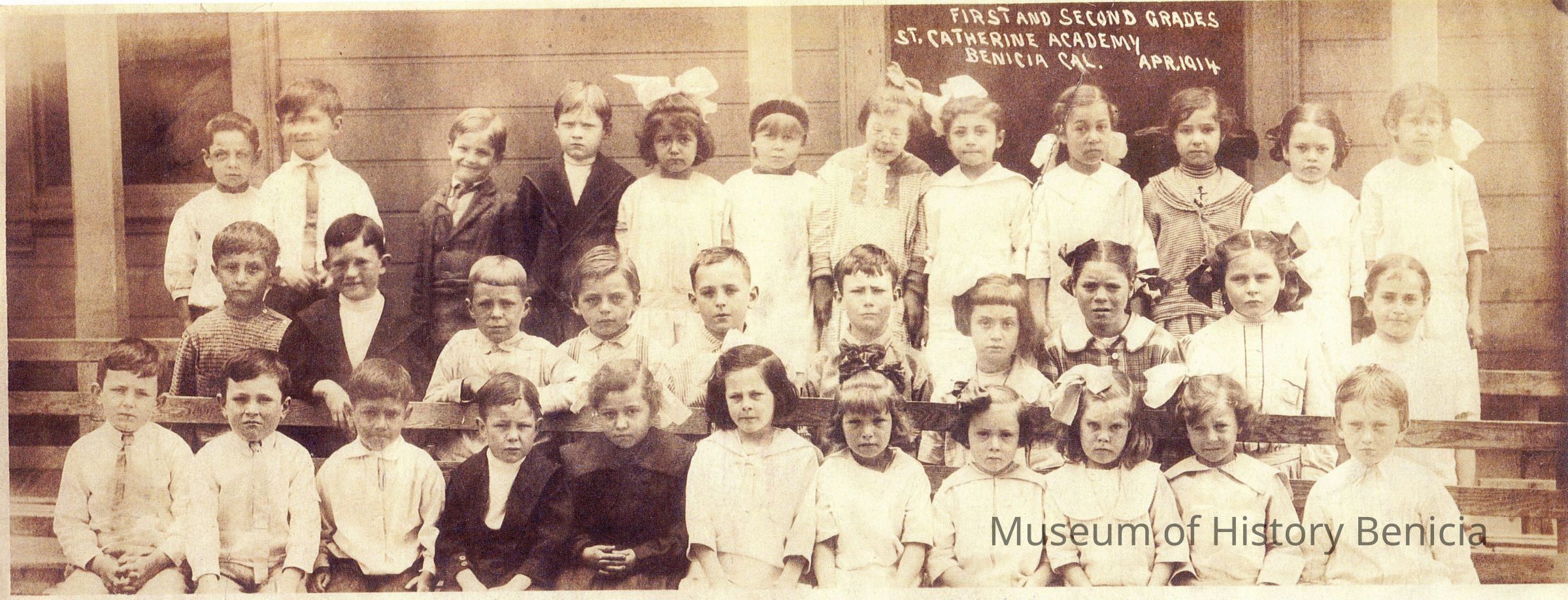 This is photograph of the First and Second grade classes at St. Catherine's in April 1914. It is a photostatic copy of an original photo.