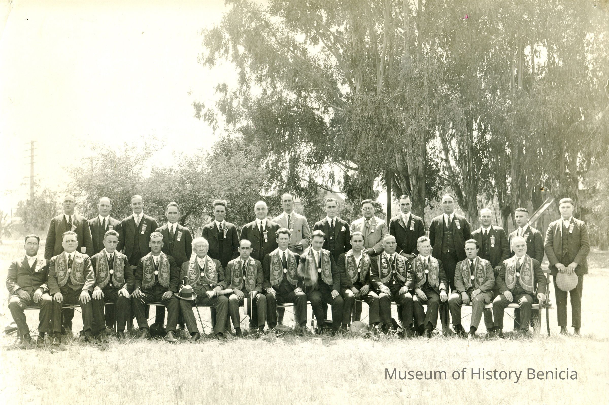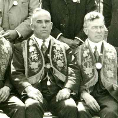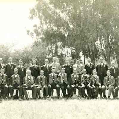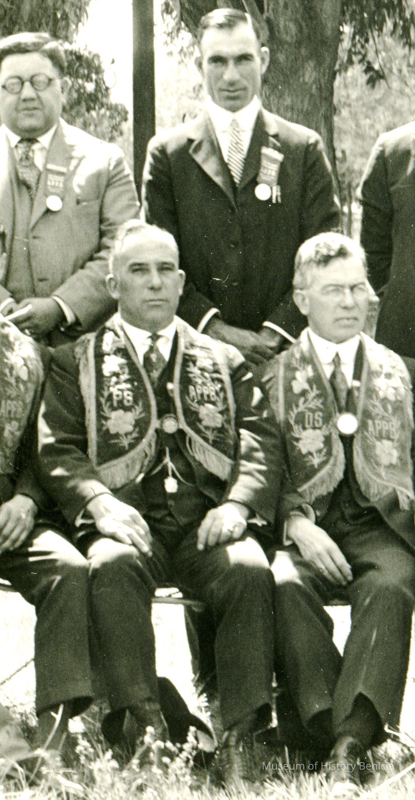 This is a photograph of a group of men who belonged to a Portugeese society. The vests of each man in front contain their rank followed by "APPB". The internet says: