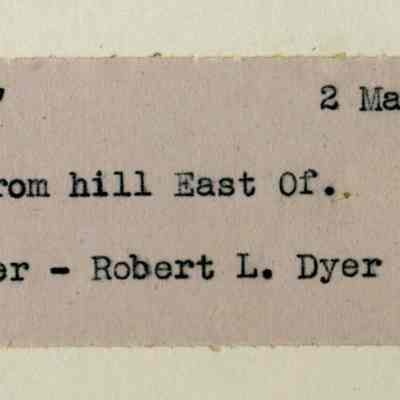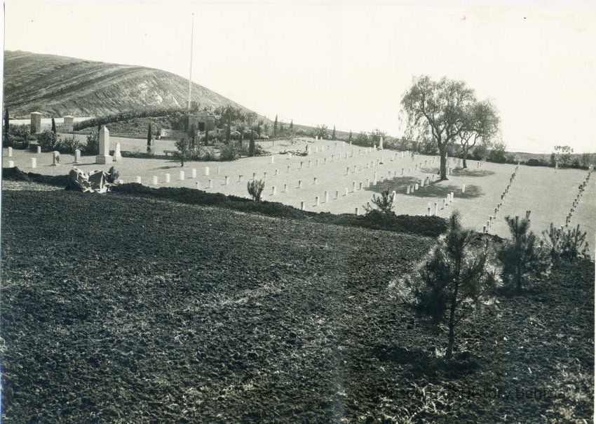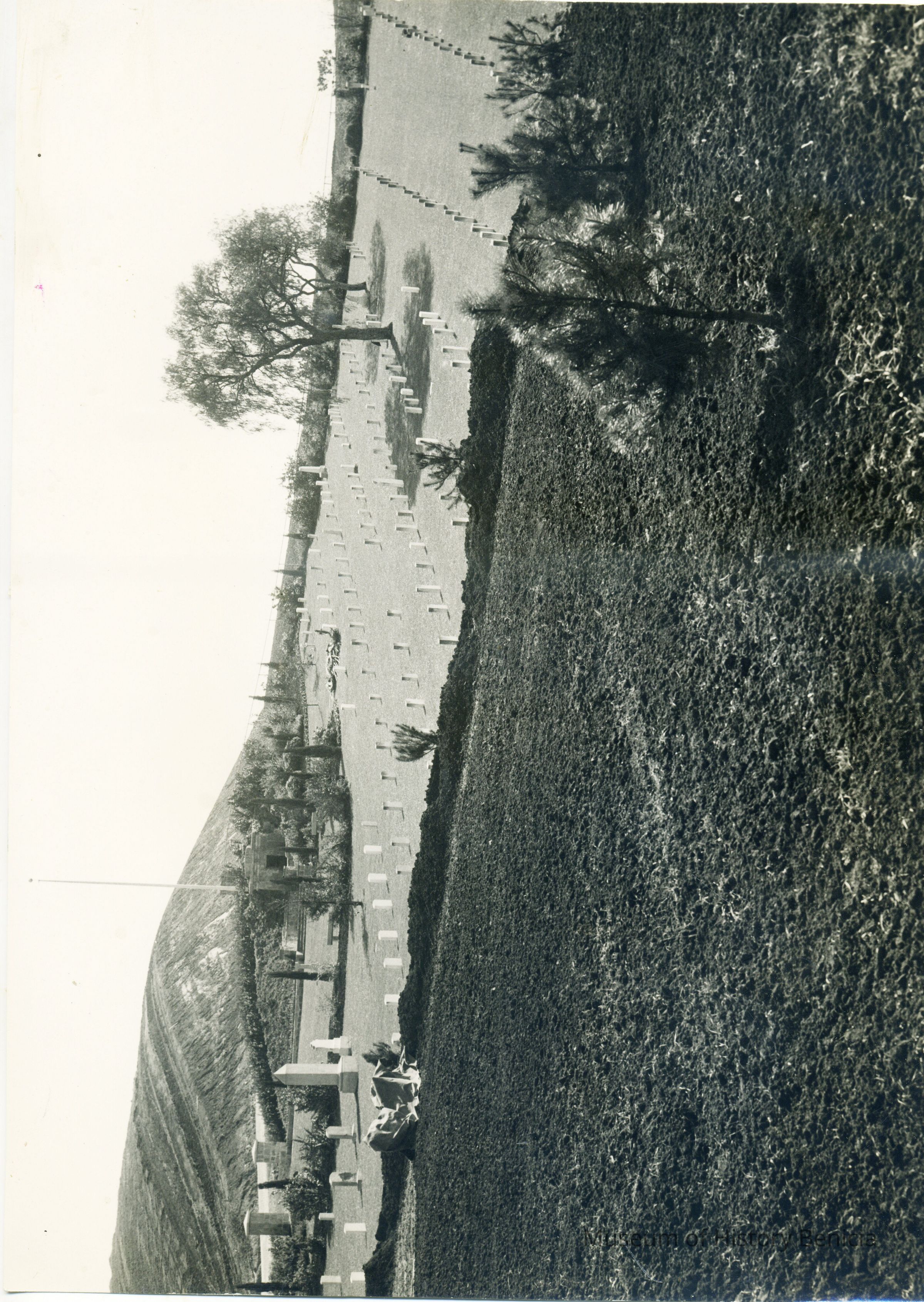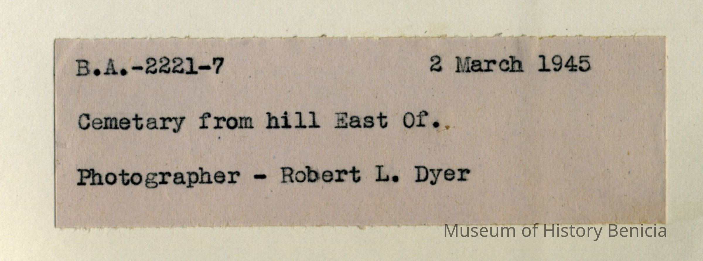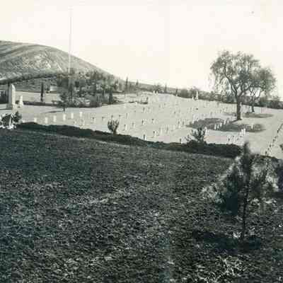 This is a photograph of the Benicia Military cemetery. It shows the incomplete Northern addition with the central cemetery in the background. The back says it was taken 03/02/1945 from a hill East of the photographer - Robert L. Dyer.Collection