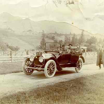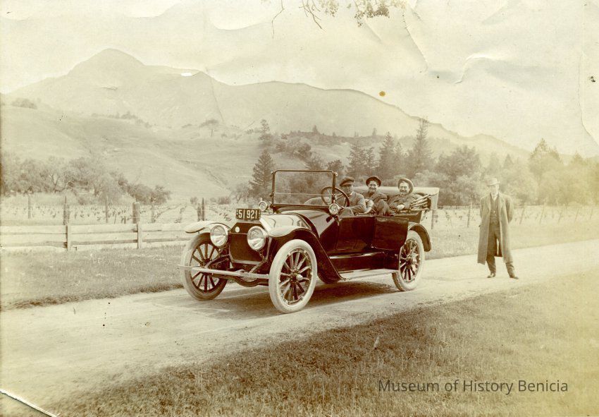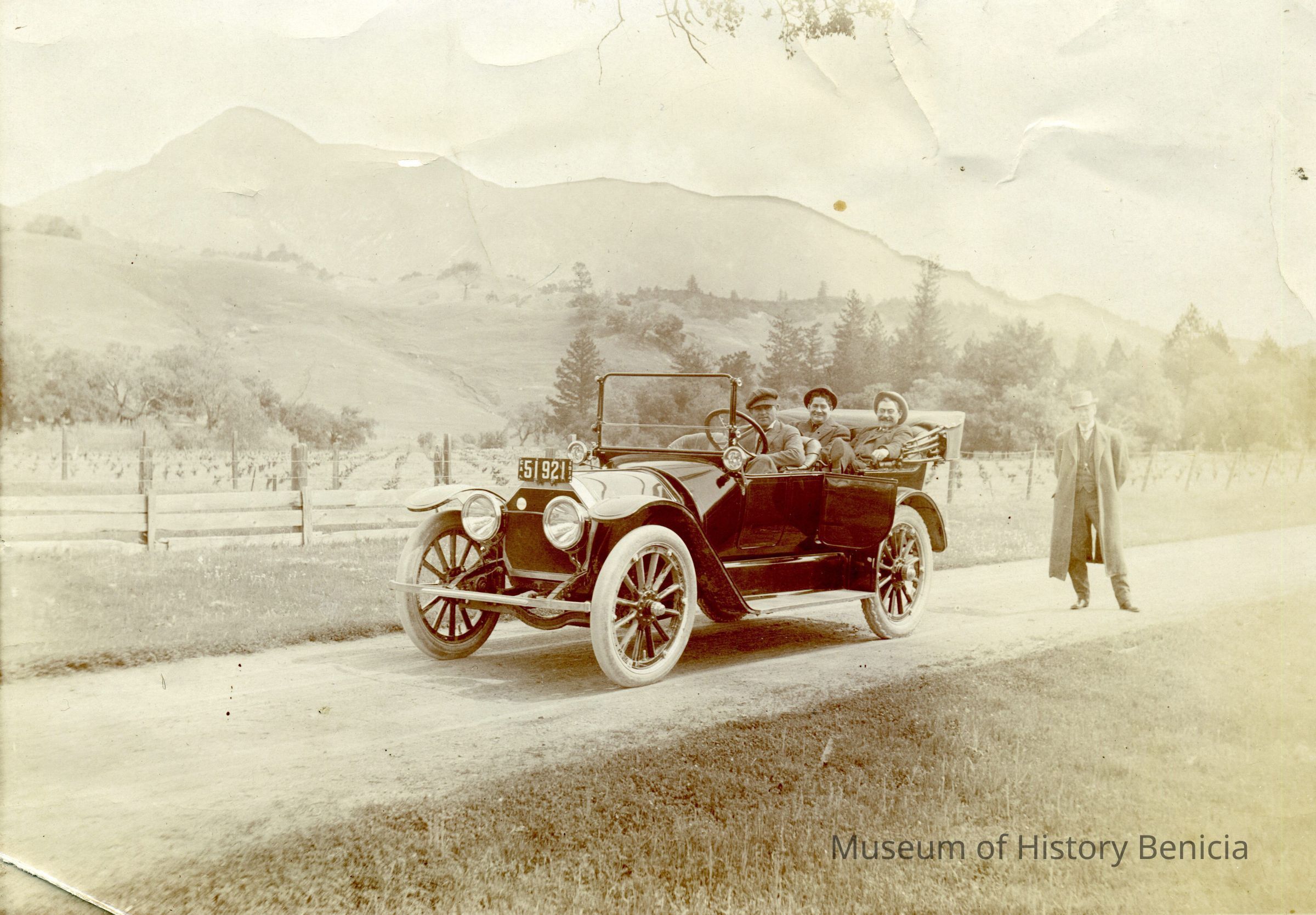 This is a photograph of an old convertable car with three men in the car and one standing outside. The man standing outside is Mayor Crooks. The man in the backseat to the right in the photo is Gustav Ganauck. I think the other man in the back seat is the man that ran the cigar stand at the Bank Exchange on First street in Benicia.