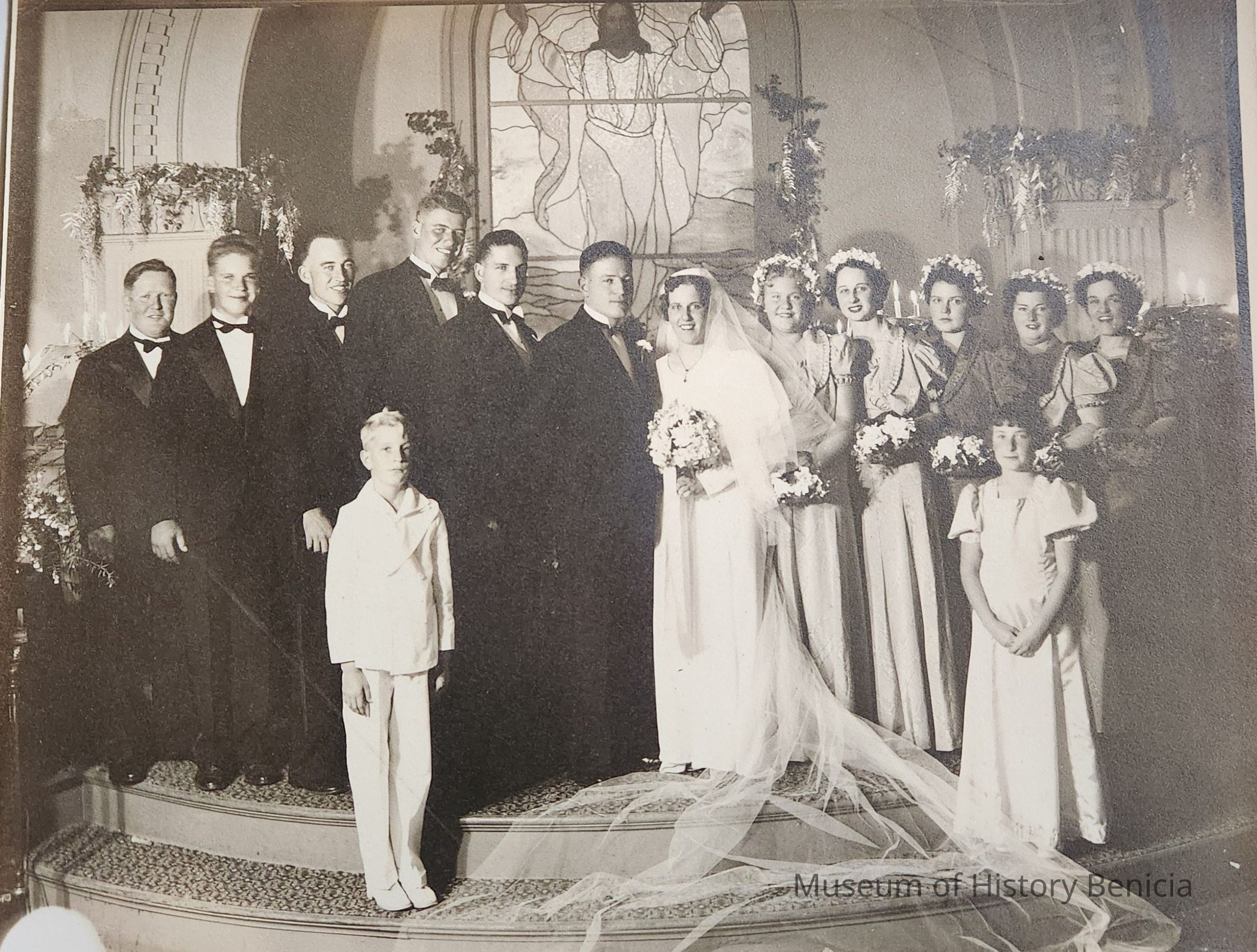B/W Photograph of a wedding party: four groomsmen, best man, groom, bride, maid of honor, four bridesmaids, ring bearer and flower girl. None of the individuals are identified.Collection