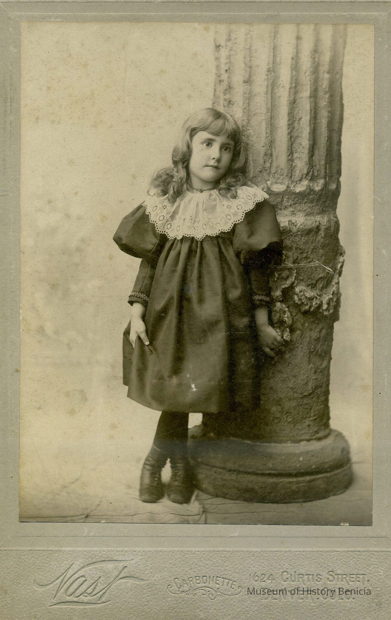 B/W Photograph, studio pose, of a young girl leaning on a post. It is mounted on mat board.