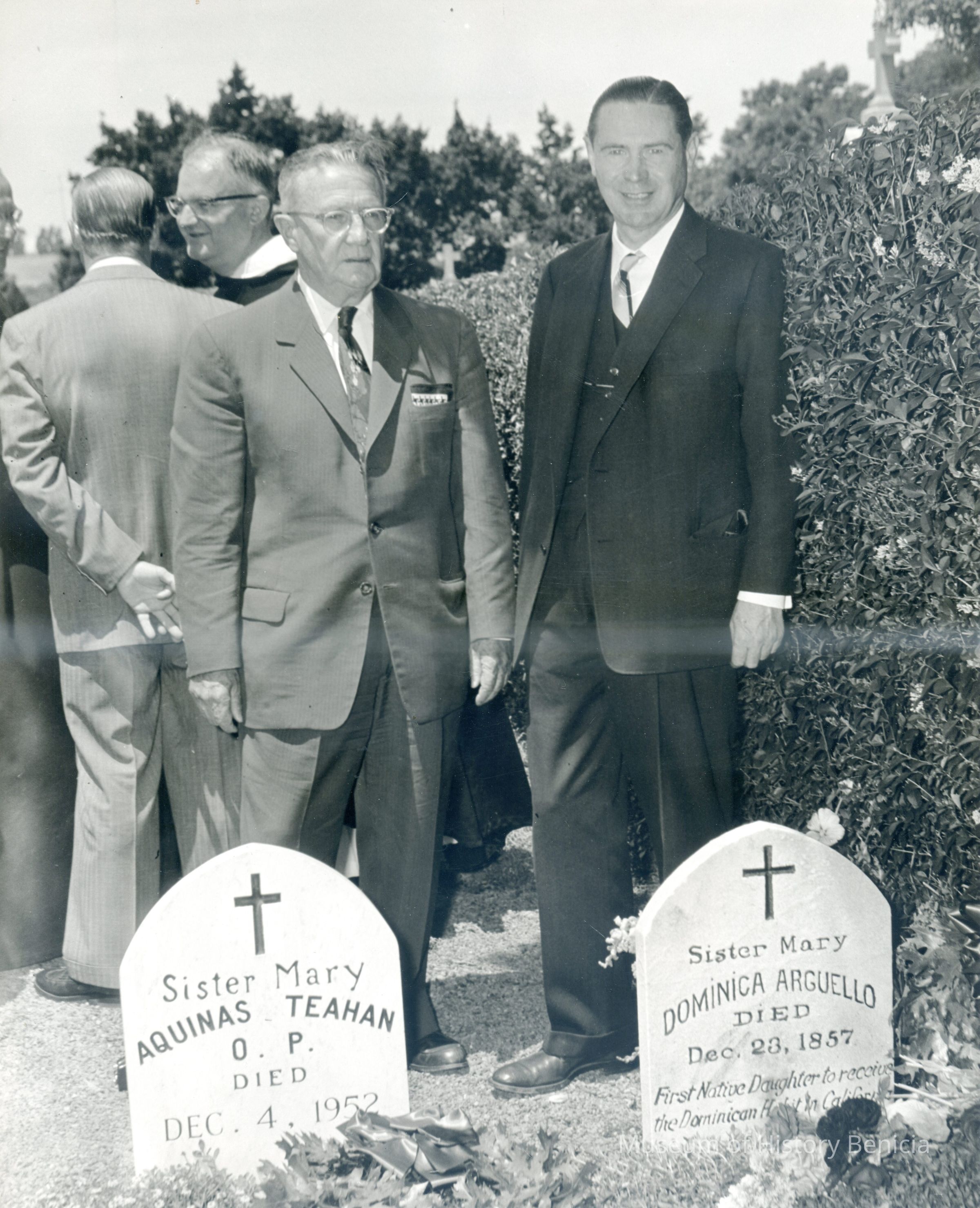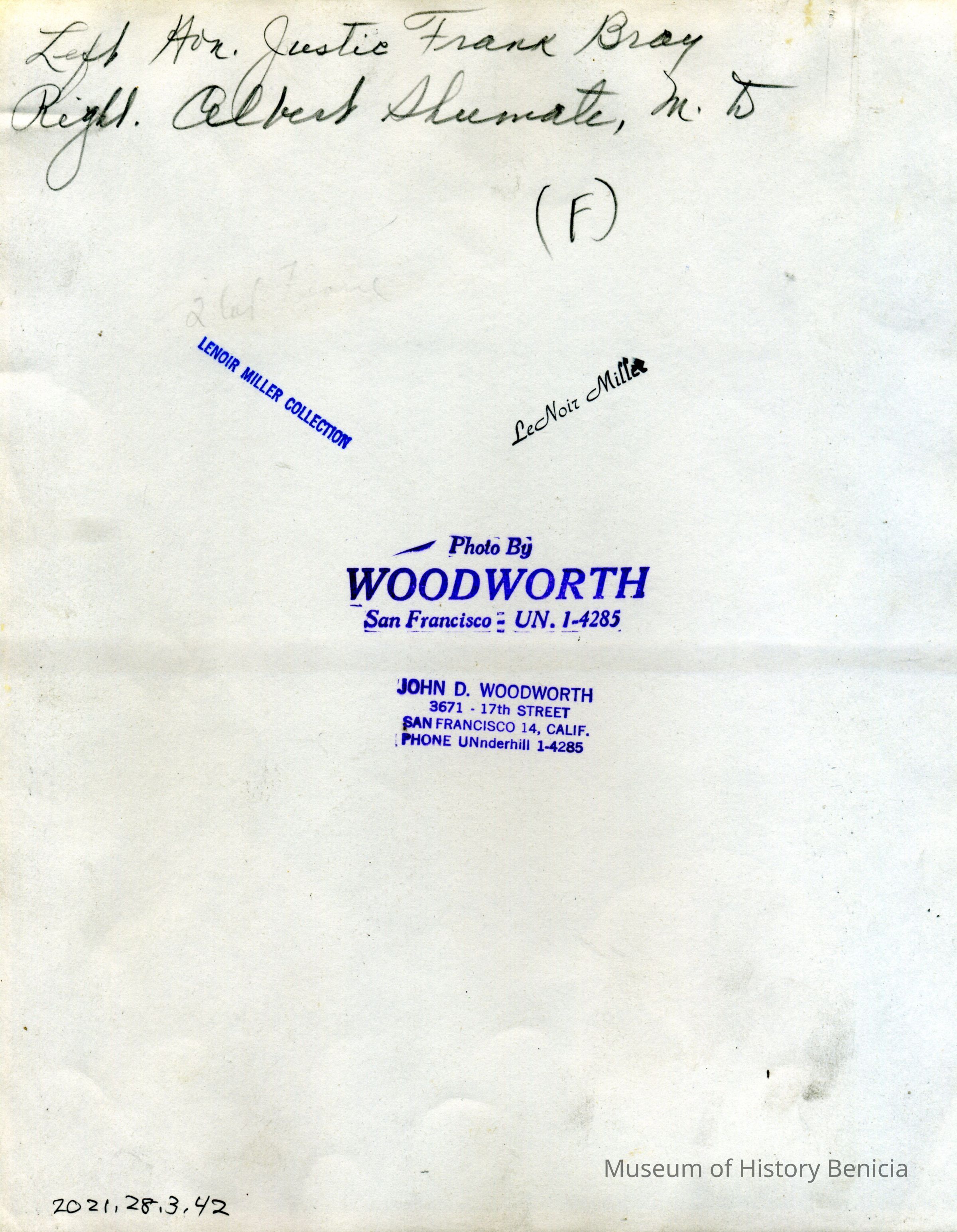 A photo of Justice Frank Bray and Dr. Albert Shumate. It was taken by Woodworth of San Francisco, CA. They are in the Benicia Catholic cemetery next to Sister Dominica Arguello's grave.Collection