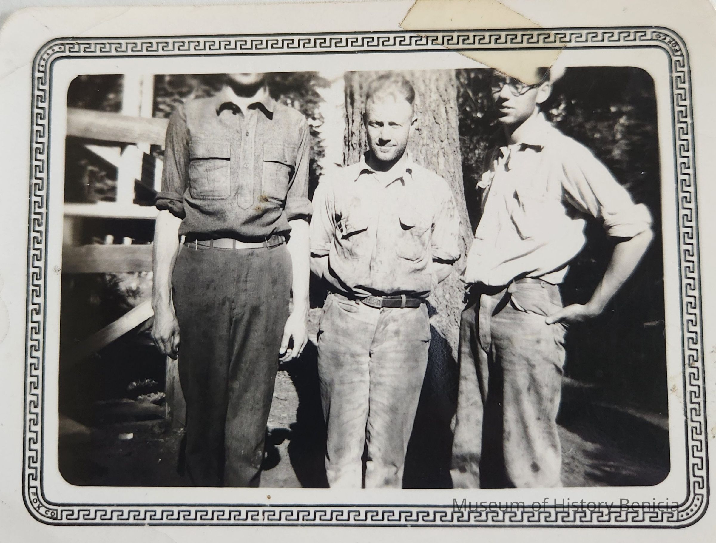 B/W Photograph with a decorative border. There are three men and the head of the man on the left is cut off at his chin.