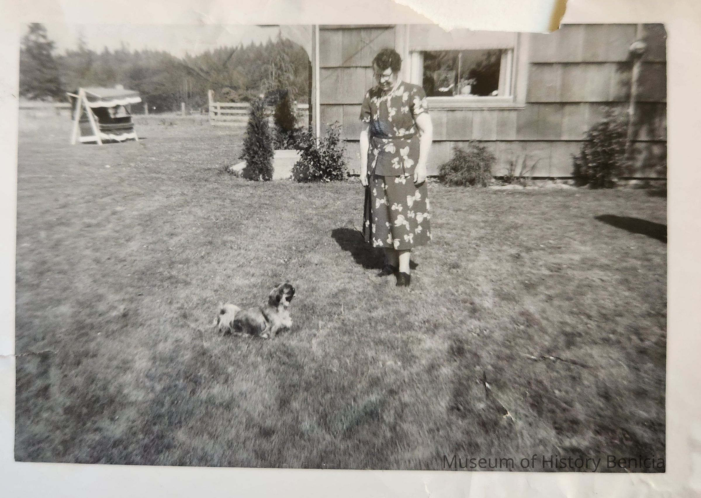 B/W Photograph of an unidentified woman with a dog at an unknown location.