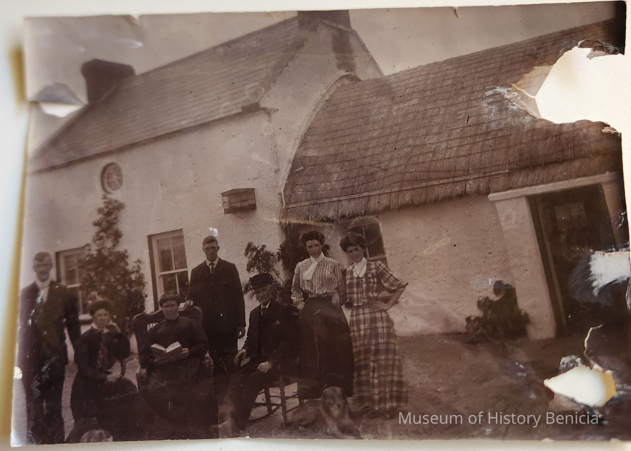 B/W Photograph of a group of unidentified adults in front of a house at an unknown location.