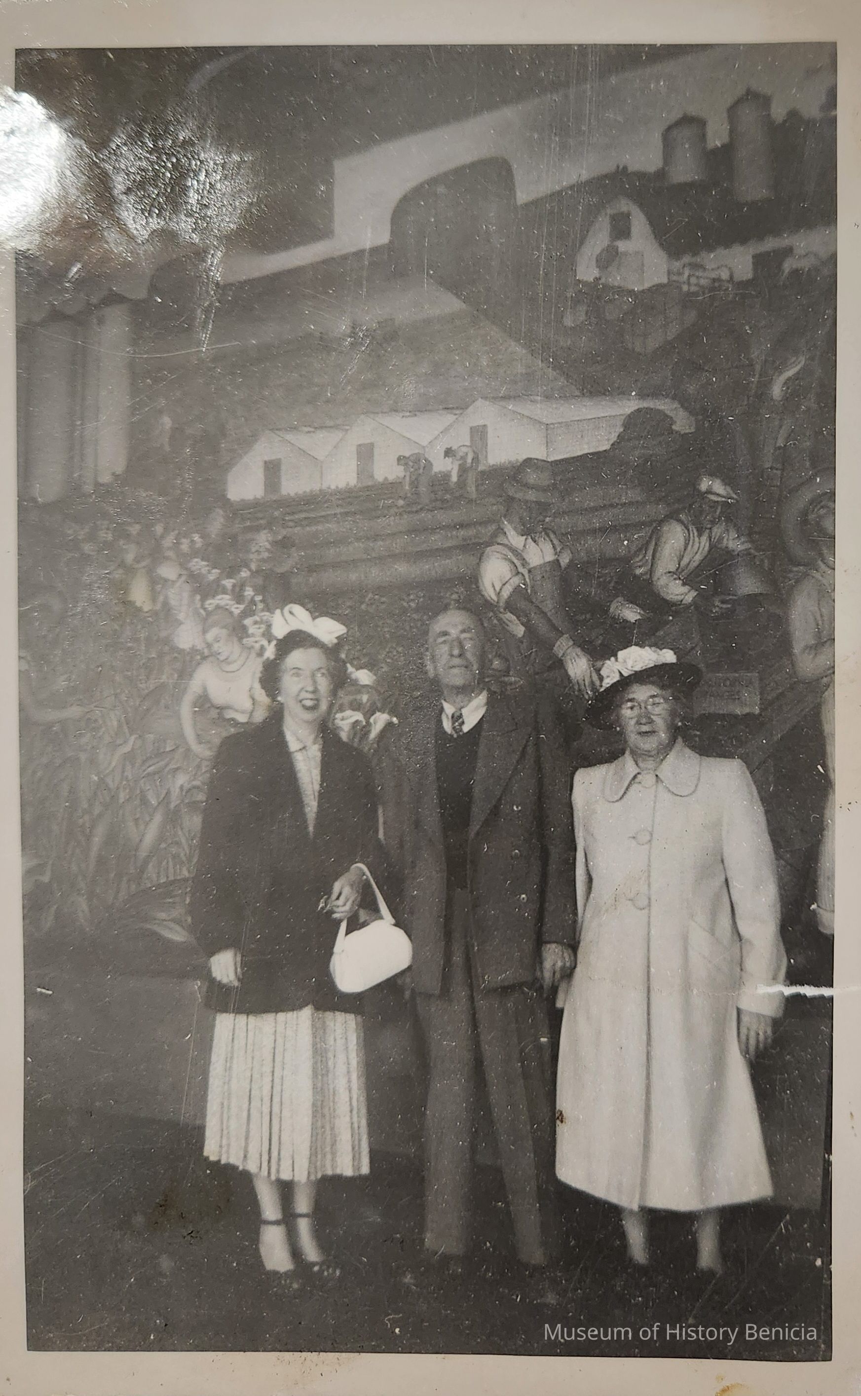 B/W Photograph of three unidentified people in front of a Maxine Albro mural in Coit Tower, San Francisco.