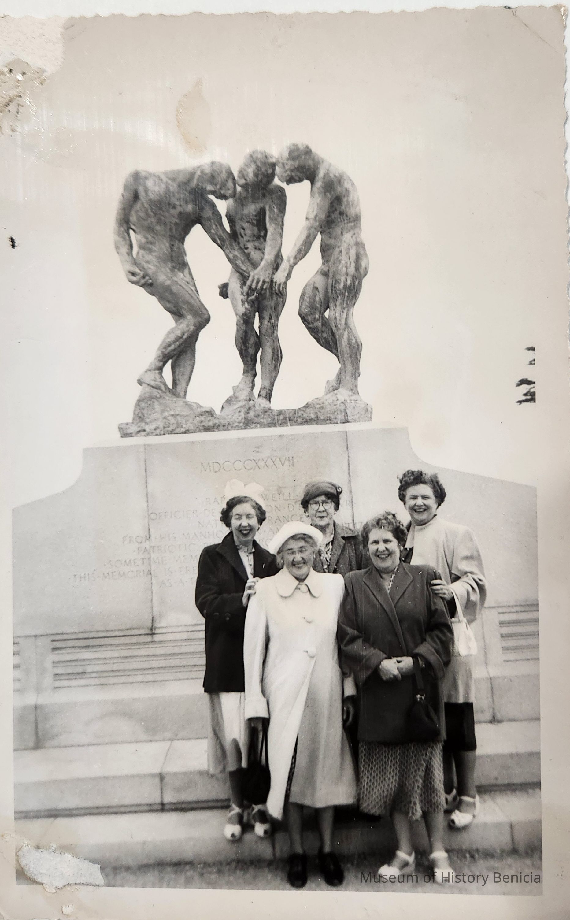 B/W Photograph of five unidentified women in front of a monument with a visible date of MDCCCXXXVII (1837) but other carving is indistinguishable. The location could be somewhere in San Francisco.Collection
