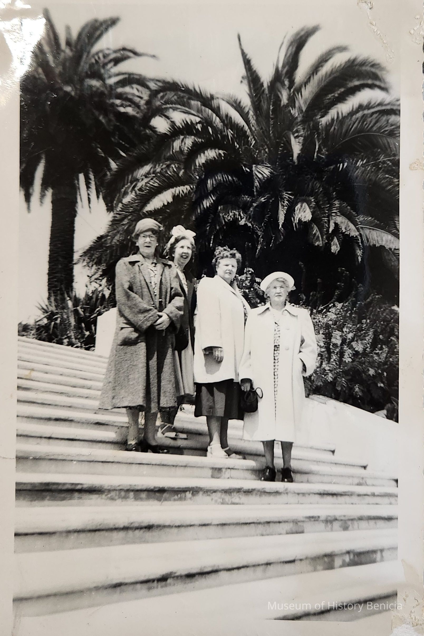 B/W Photograph of four unidentified women on some stairs with plam trees in the background. It was likely taken in Golden Gate Park, San Francisco.