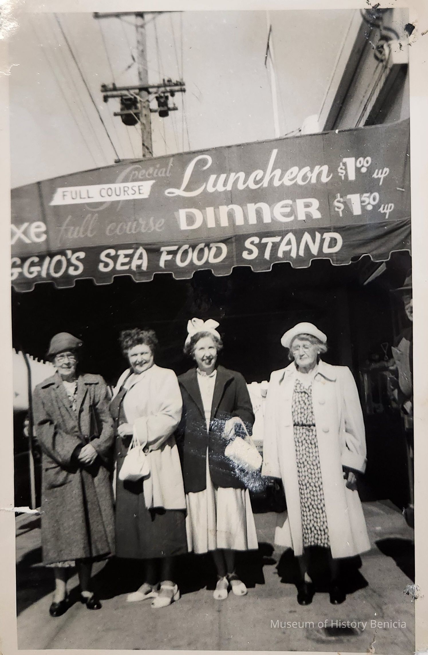 B/W Photograph of four unidentified women standing in front of DiMaggio's Restaurant in San Francisco at Fisherman's Wharf
