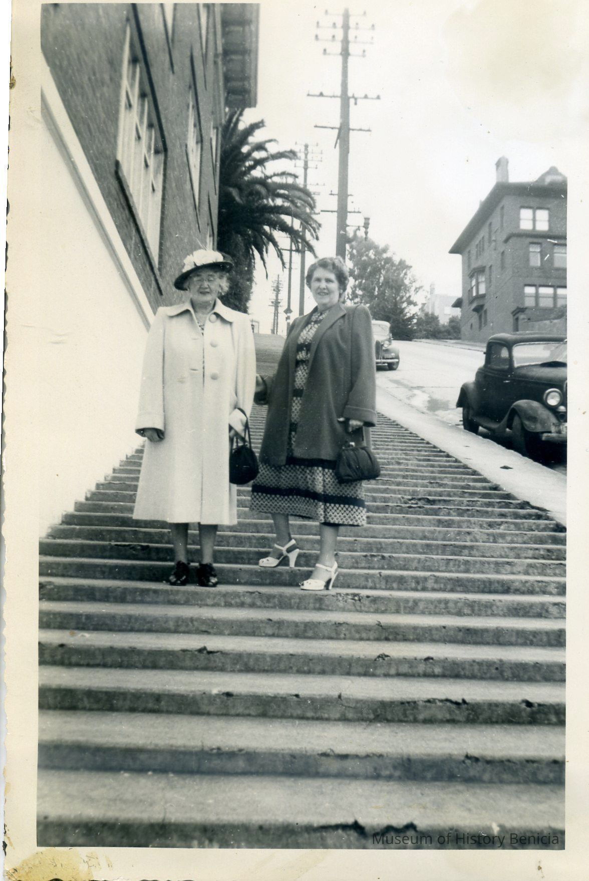 B/W Photograph of two women on stairs of a steep San Francisco street. Scallop-edged photograph.