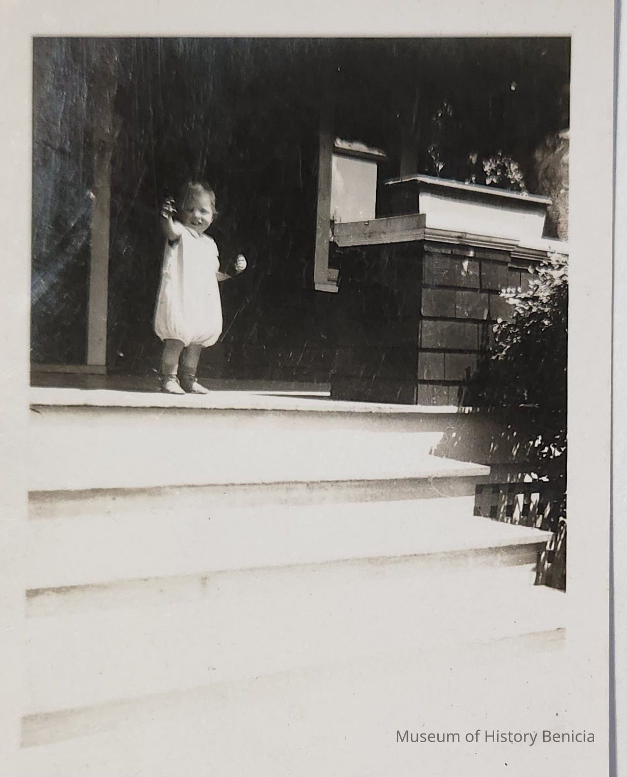 B/W Photograph of a small child on a porch. It could be the Rankin home on East J St.