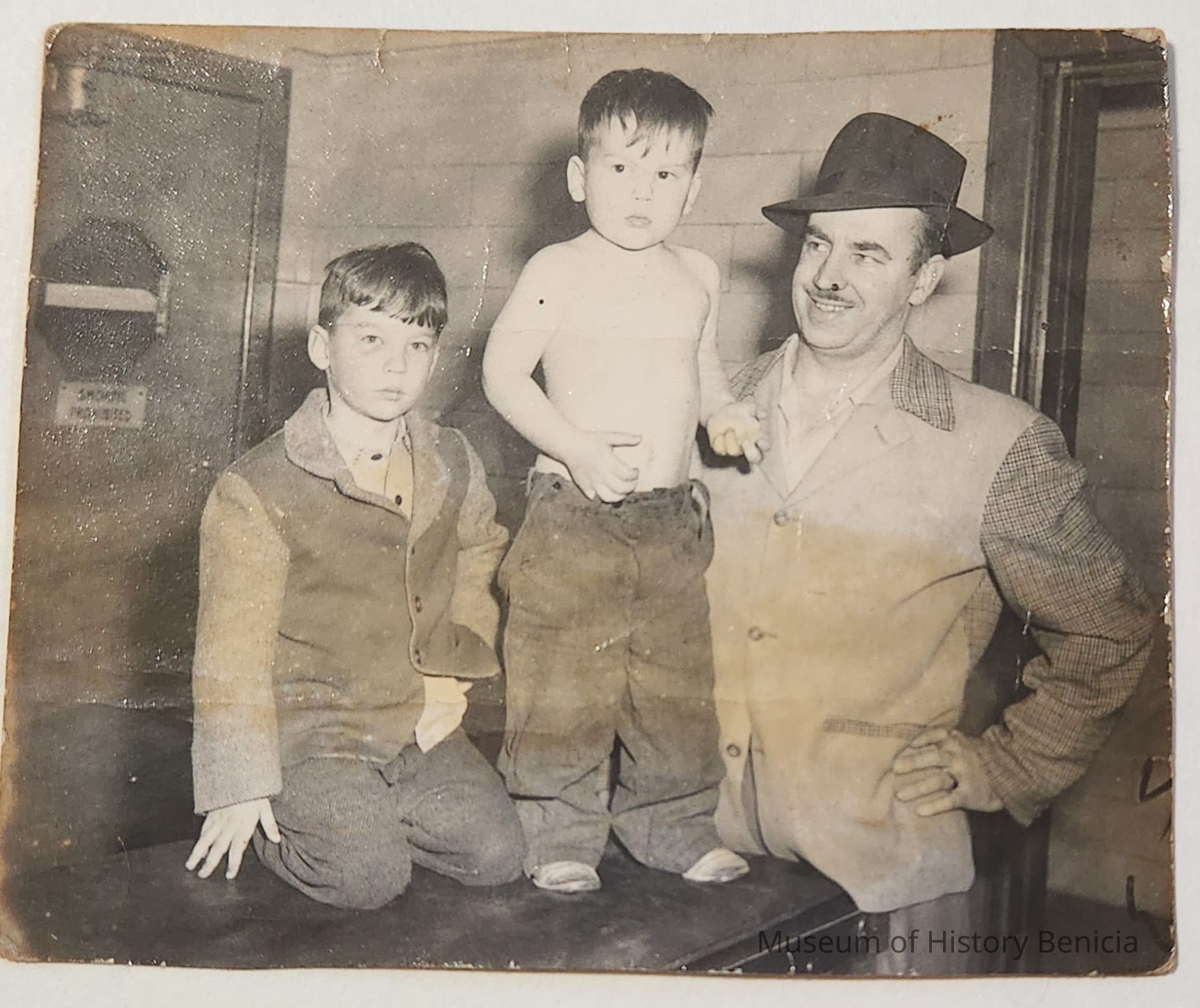 B/W Photograph of a man with two young boys. They are unidentified at an unknow location.