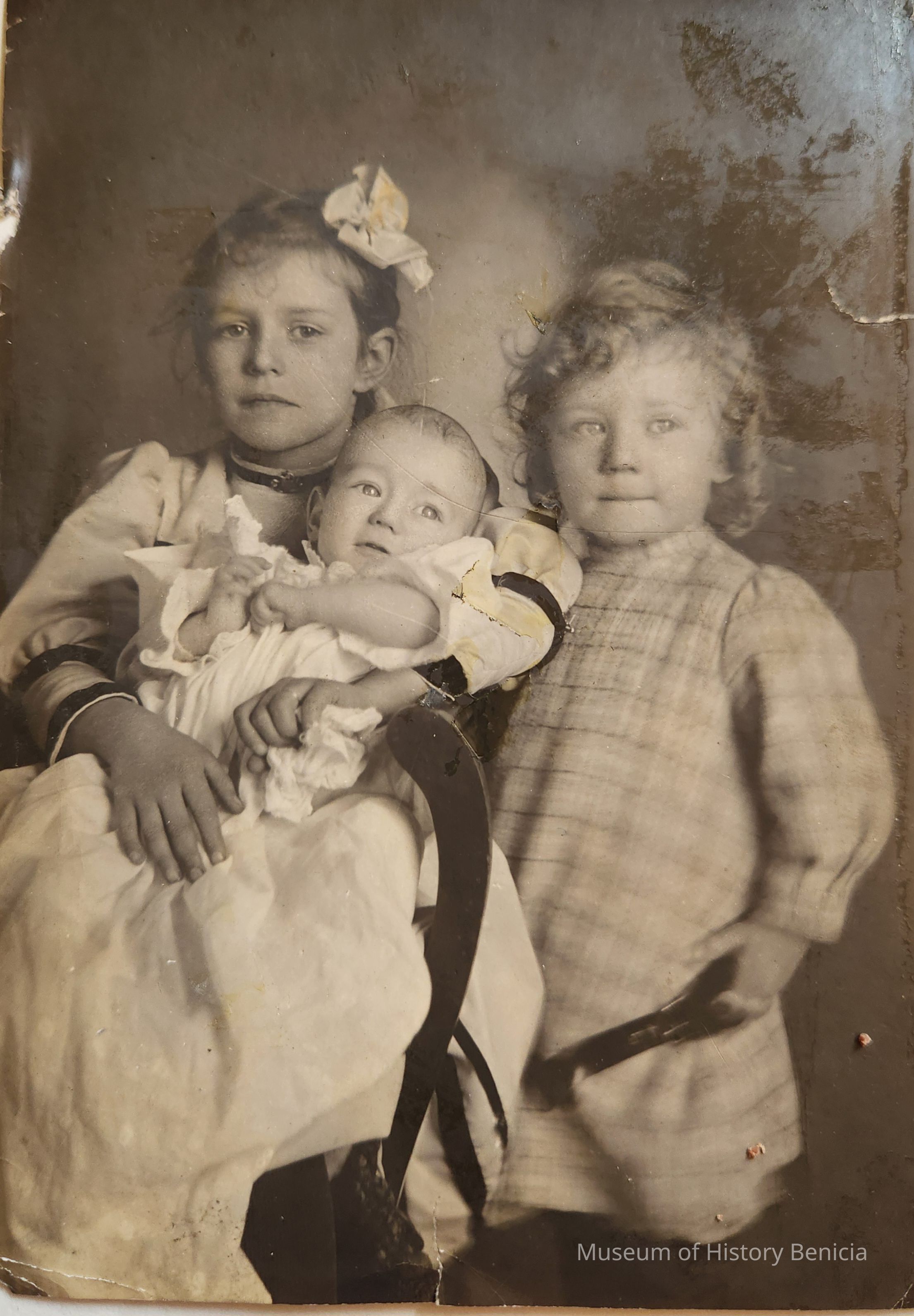B/W Photograph of two young children and a baby They are unidentified at an unknown location.