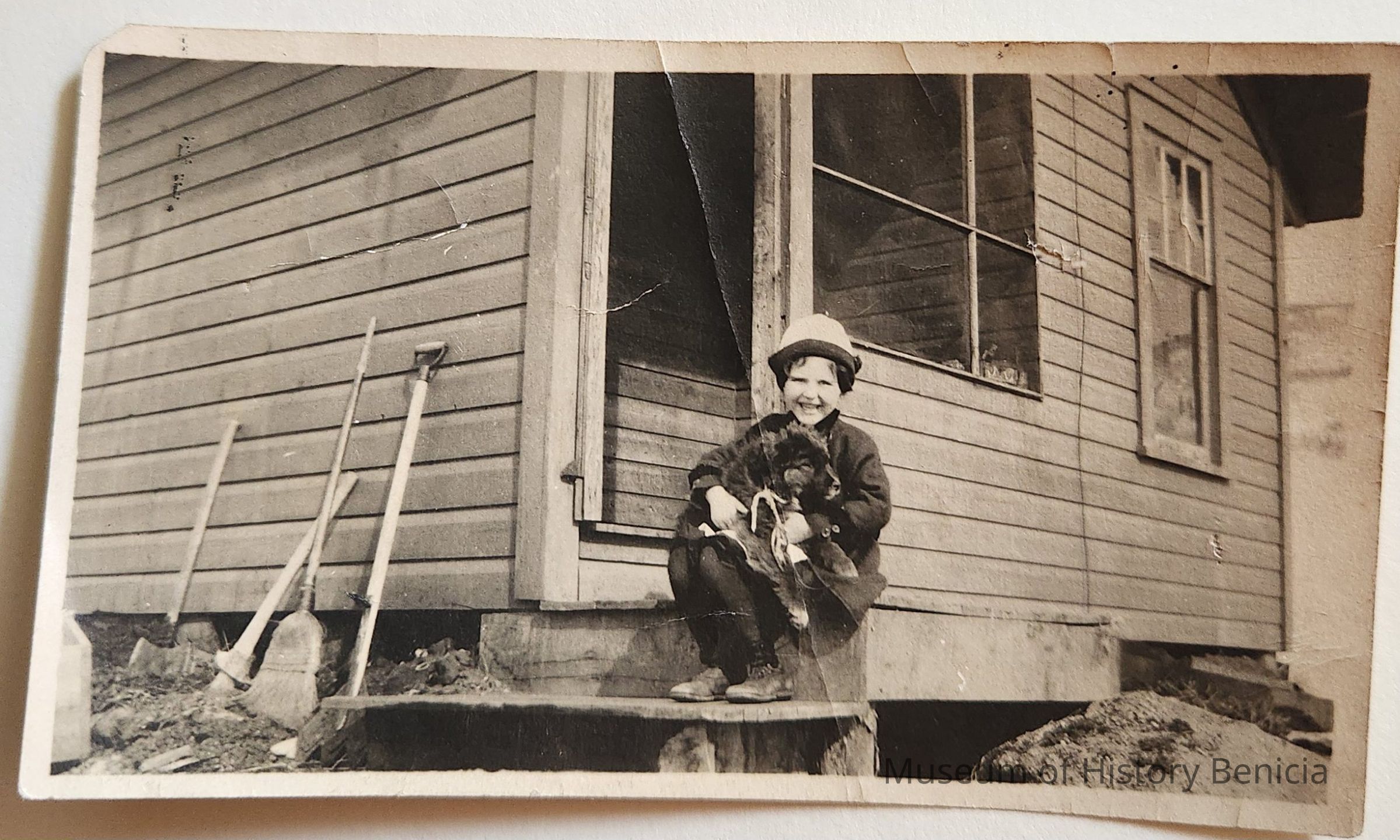 B/W Photograph of a young person holding a dog, sitting on a porch at an unknown location.
