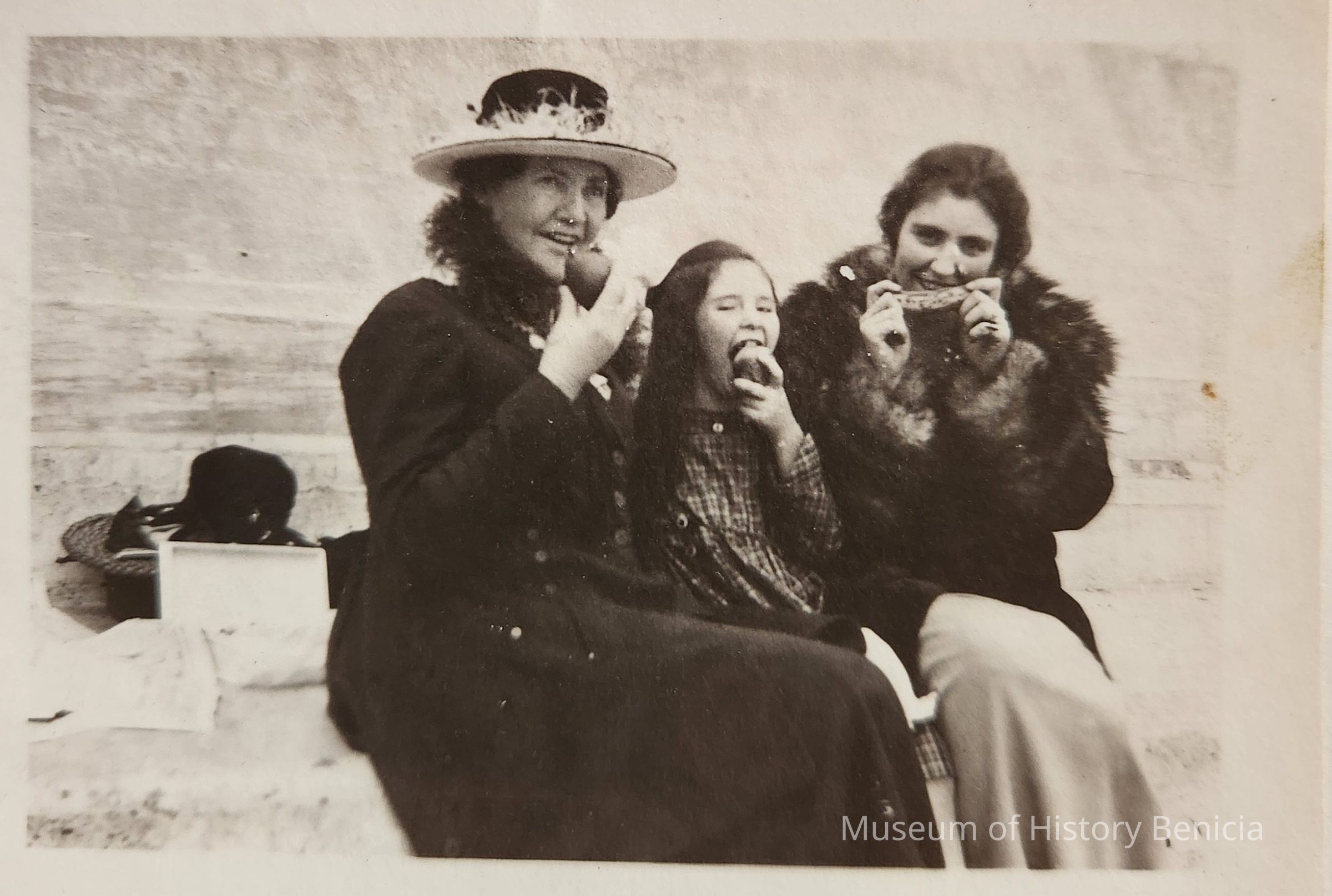B/W Photograph of two women and a young girl eating at an unknown outdoor location.