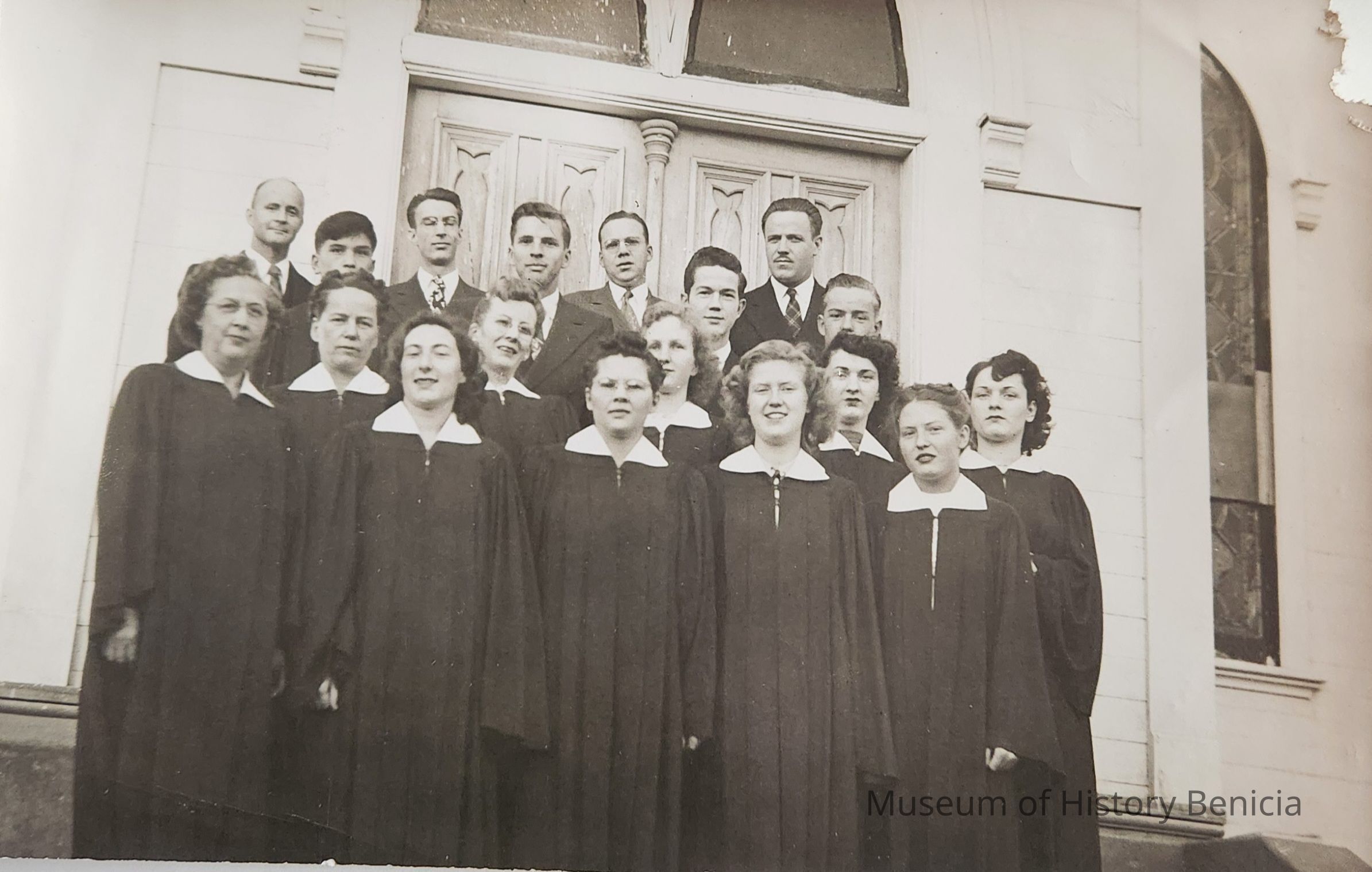 B/W Photograph of a group of adults. They seem to be a church choir standing on the steps of their church.